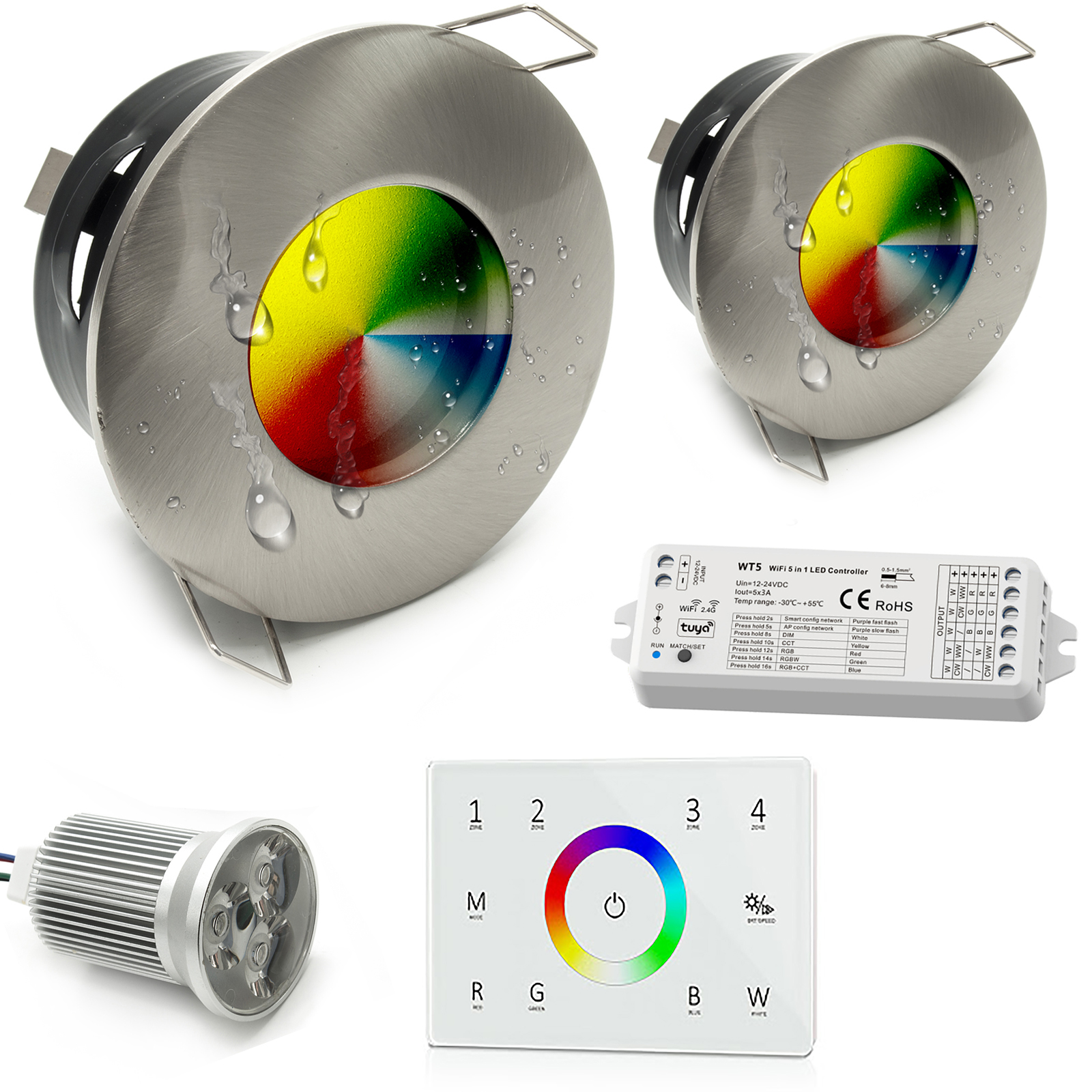 KIT cromoterapia RGB composto da N° 2 porta faretti ad incasso IP65 a tenuta stagna, N° 2 lampade LED RGBW, una centralina WiFi con controllo vocale compatibile con Amazon Alexa e Google Home ed un alimentatore da 24V, 1 Pannello touch dimmer