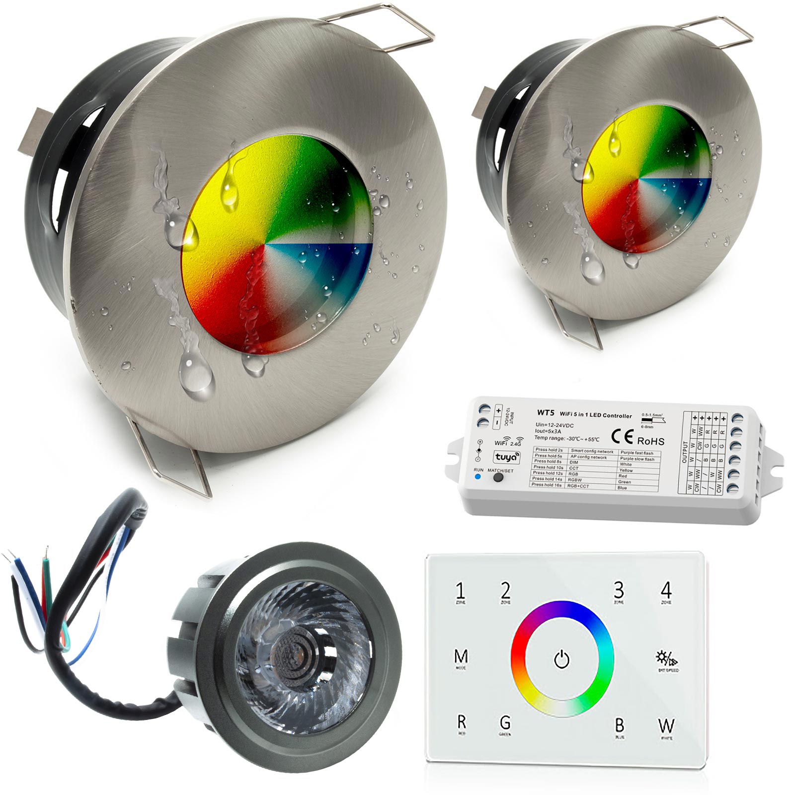 KIT cromoterapia RGB composto da N° 2 porta faretti ad incasso IP65 a tenuta stagna, N° 2 lampade LED RGBW, una centralina WiFi con controllo vocale compatibile con Amazon Alexa e Google Home ed un alimentatore da 24V, 1 Pannello touch dimmer