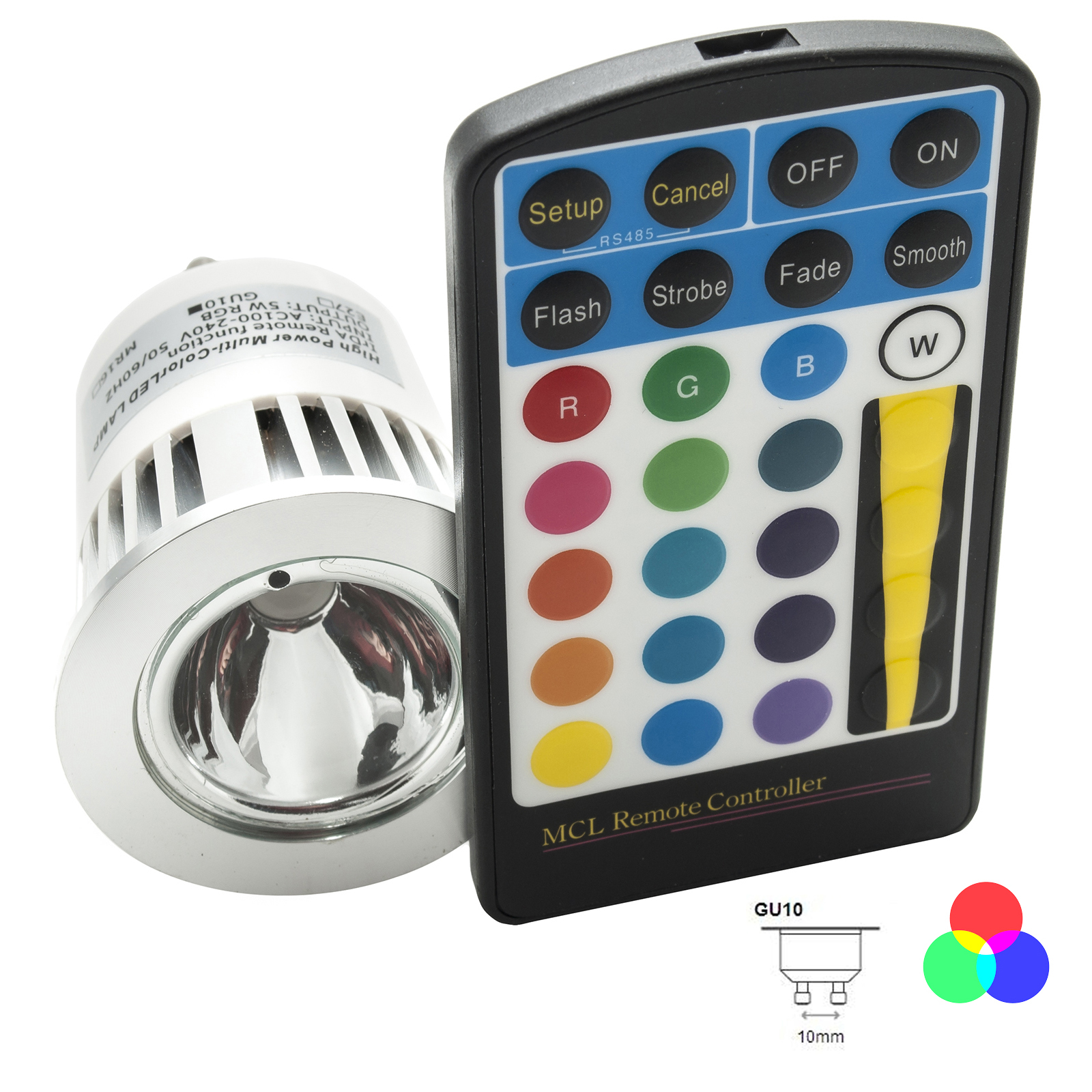 Lampada LED GU10 RGB 1X5Watt 220Volt 16 colori gestibile direttamente dal telecomando in dote. RESA LUMINOSA CIRCA 50W
