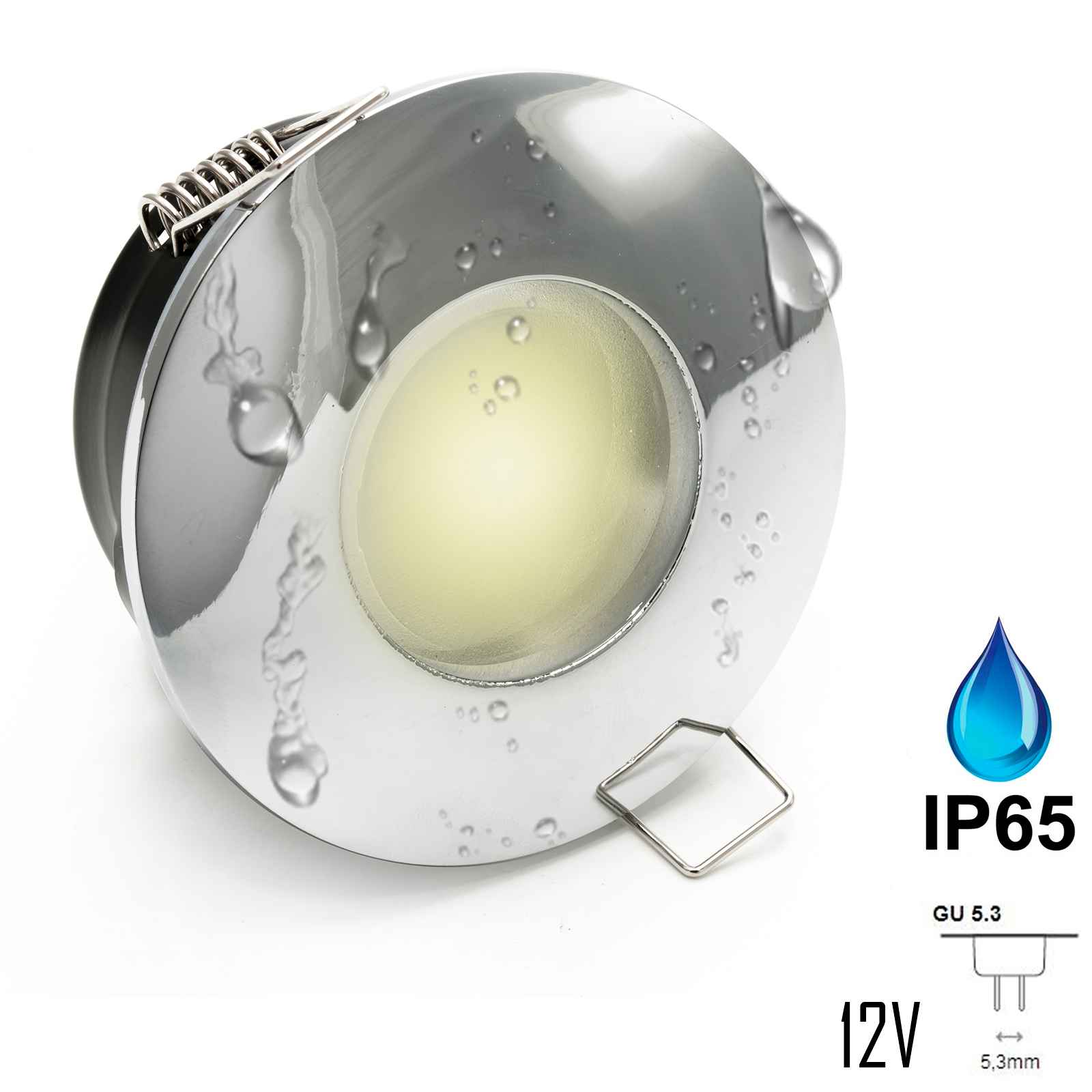 Faretto led 8W 12V GU5.3 bassa tensione a tenuta stagna realizzato in alluminio pressofuso verniciato a polveri epossidiche resistente all'acqua ideale per ambienti umidi. Alimentatore non incluso. Questo faretto è particolarmente indicato per l’illuminazione di box docce - bagno turco - vasca. Completo di controcassa in alluminio ha un grado di protezione IP65 ideale per essere incassato in box doccia bagni turchi e in tutti quei posti dove c'è umidità. Il porta faretto può essere installato nel controsoffitto tramite alette oppure grazie alla controcassa removibile in alluminio è possibile inserirlo in soffitti in muratura. Dimensioni del foro per l'incasso 70 mm - Diametro del faretto 85 mm – Altezza totale 60 mm (compreso di portalampada). Il faretto è disponibile luce calda, fredda o naturale - Alimentazione a 12V (Alimentatore non incluso) – attacco lampada GU5.3 Il kit include: 1 faretto colore a scelta IP65 – 1 lampada led 7w - 1 portalampada con attacco GU5.3