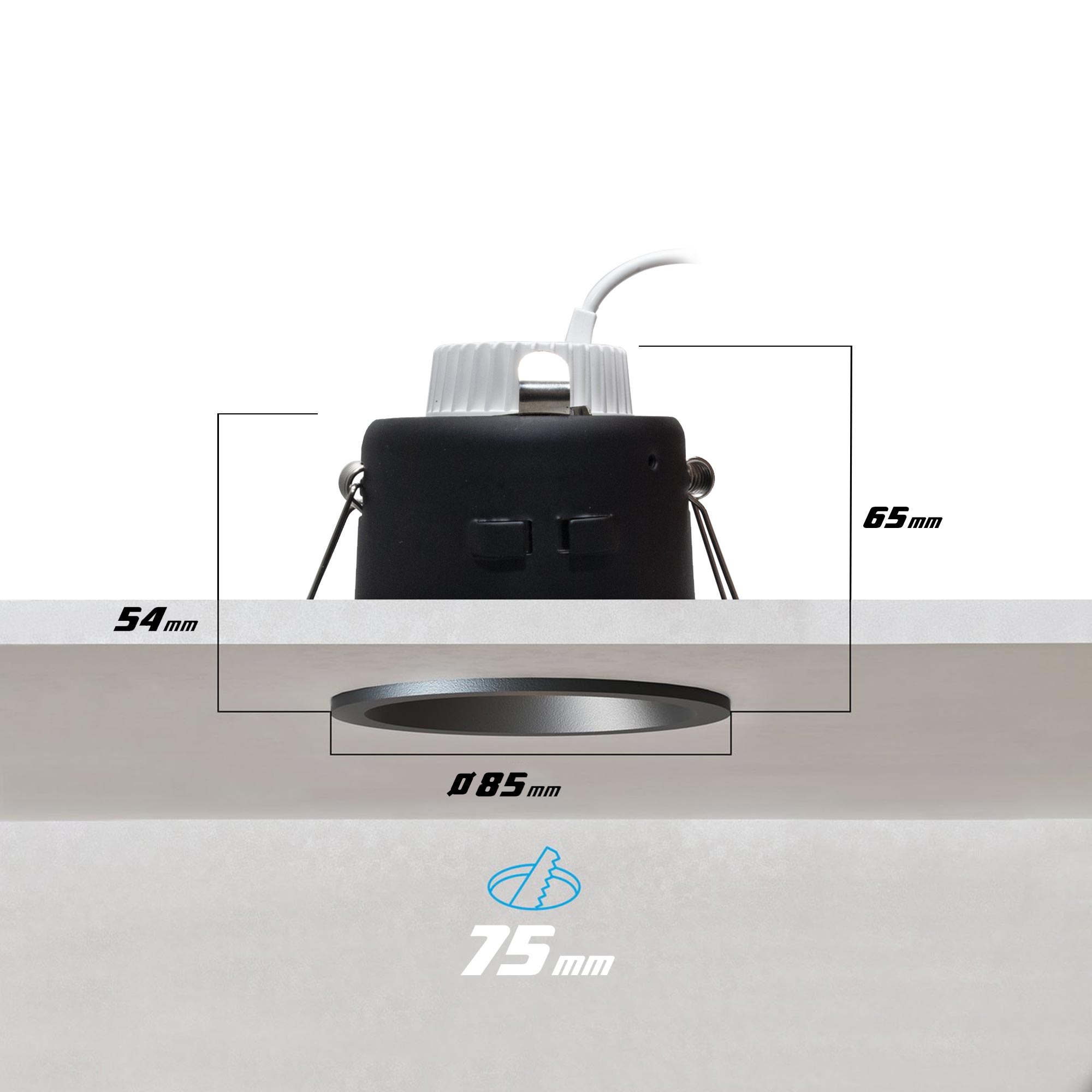 Dimensioni del faretto: Diametro esterno: 85 mm - Altezza totale comprensiva di modulo LED: 65 mm - Foro d’incasso consigliato: 75 mm.