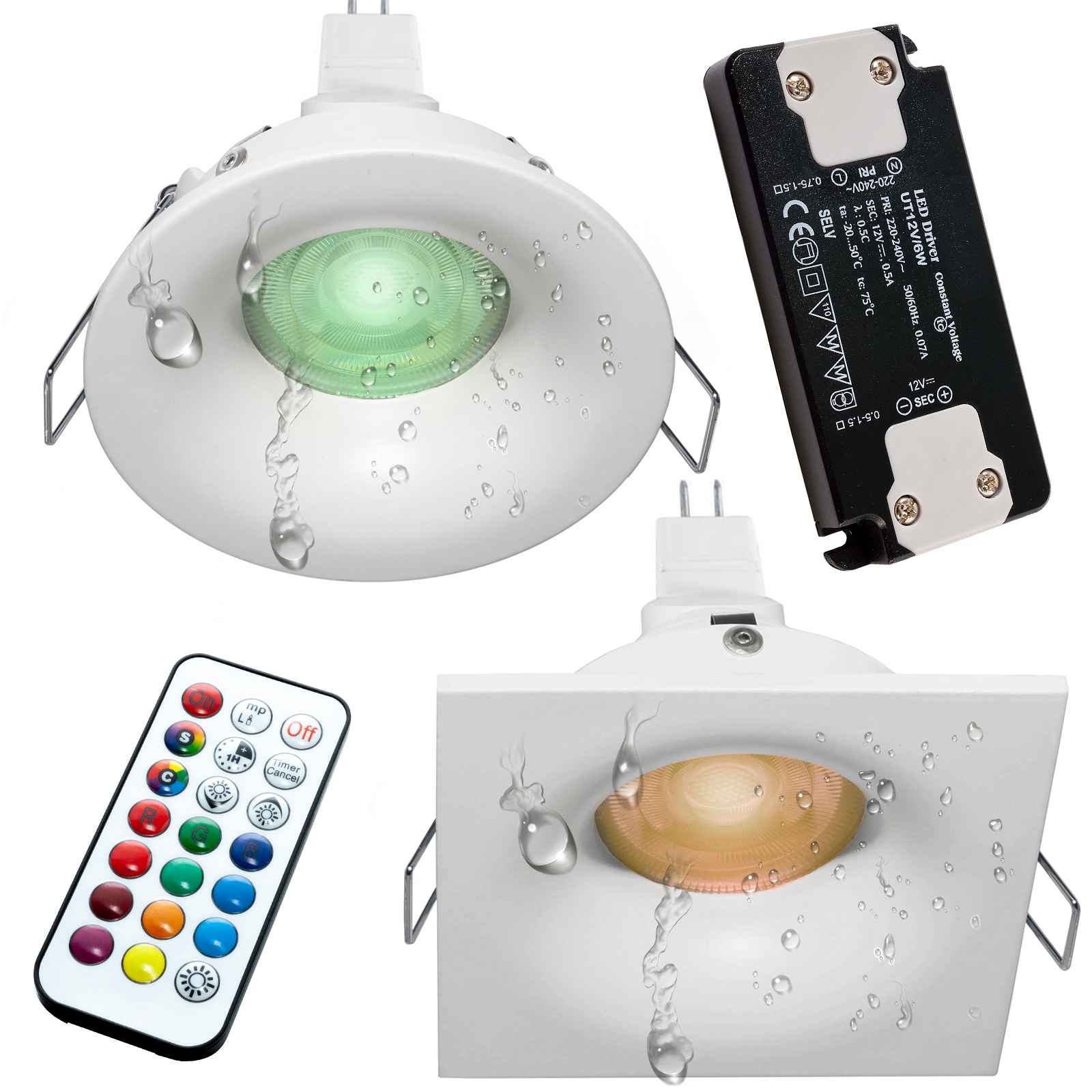 Faretto da incasso adatto per la cromoterapia di box doccia, saune, bagno turco, composto da un portafaretto con grado di protezione IP65 completamente a tenuta stagna, una lampada RGB+W da 6W attacco GU5.3 a bassa tensione, un telecomando IR ed un alimentatore a 12V. Il faretto viene fornito completo di attacchino per il corretto collegamento della lampada.