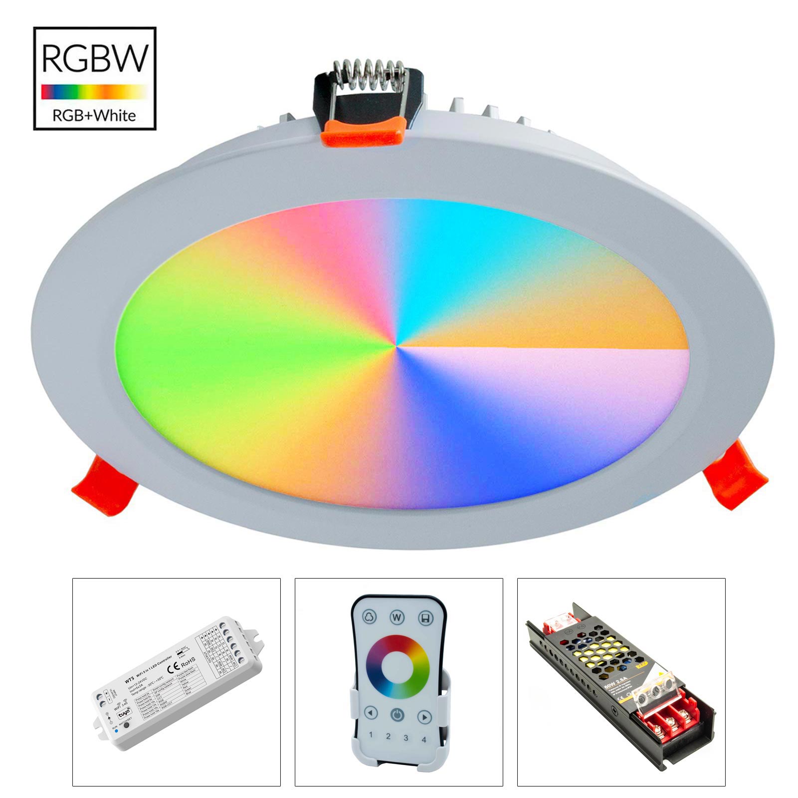 KIT completo di pannello LED RGBW da incasso, centralina SMART WiFi con controllo vocale, un telecomando RF ed un alimentatore 24V.