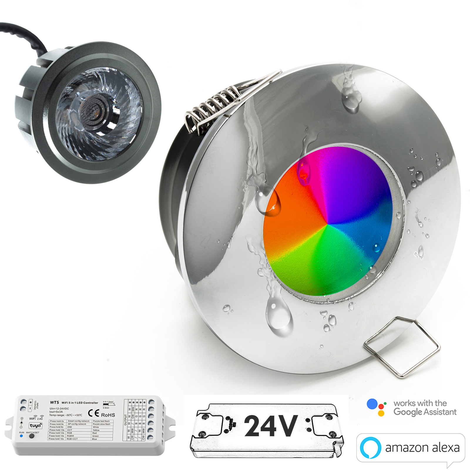 KIT cromoterapia RGBW completo di porta faretto ad incasso IP65 a tenuta stagna, una lampada LED RGBW disponibile con temperatura RGB+3000K luce calda e RGB+4000k luce naturale, una centralina WiFi con controllo vocale compatibile con Amazon Alexa e Google Home ed un alimentatore da 24V dc.