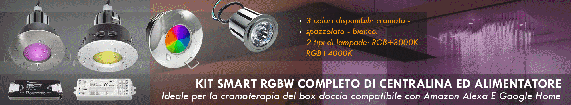 KIT cromoterapia RGBW completo di porta faretto ad incasso IP65 a tenuta stagna, una lampada LED RGBW disponibile con temperatura RGB+3000K luce calda e RGB+4000k luce naturale, una centralina WiFi con controllo vocale compatibile con Amazon Alexa e Google Home ed un alimentatore da 24V dc.