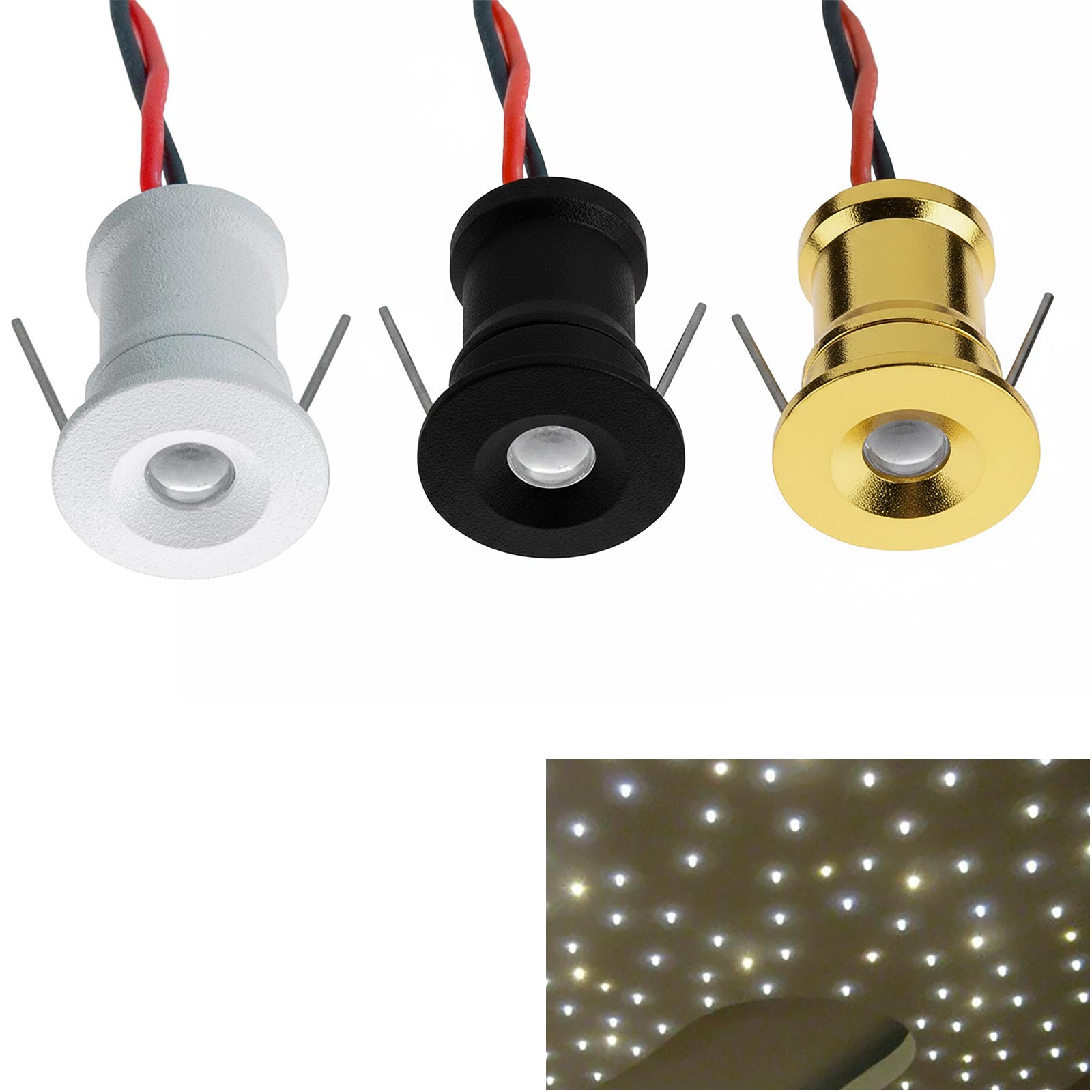 Mini punto luce LED ad incasso a bassa tensione con potenza 1W a 12V ideale per realizzare spettacolari effetti di cielo stellato e non solo utile anche per l'illuminazione di vetrine di negozi, bacheche, espositori, armadi, ripiani di mobili, mensole. Dotato di grado di protezione IP65 è resistente alle intemperie e gli agenti atmosferici, adatto anche l'illuminazione in ambienti con presenza di umidità come bagni, box doccia o anche per usi in ambienti esterni come segnapassi, per l'illuminazione di percorsi, scale, scalinate. Ideale anche come punto luce per illuminare gli interni di barche, camper.