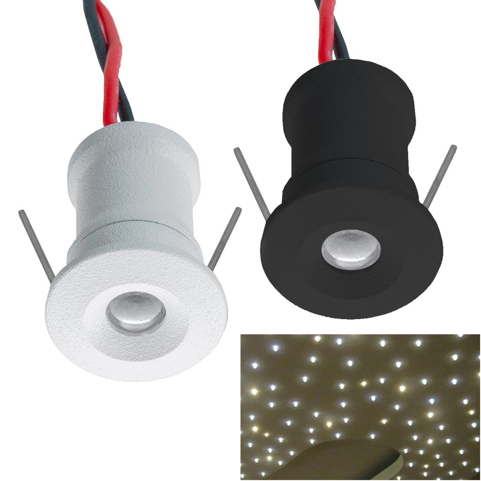 Mini punto luce LED ad incasso a bassa tensione con potenza 1W a 12V ideale per realizzare spettacolari effetti di cielo stellato e non solo utile anche per l'illuminazione di vetrine di negozi, bacheche, espositori, armadi, ripiani di mobili, mensole. Dotato di grado di protezione IP65 è resistente alle intemperie e gli agenti atmosferici, adatto anche l'illuminazione in ambienti con presenza di umidità come bagni, box doccia o anche per usi in ambienti esterni come segnapassi, per l'illuminazione di percorsi, scale, scalinate. Ideale anche come punto luce per illuminare gli interni di barche, camper.