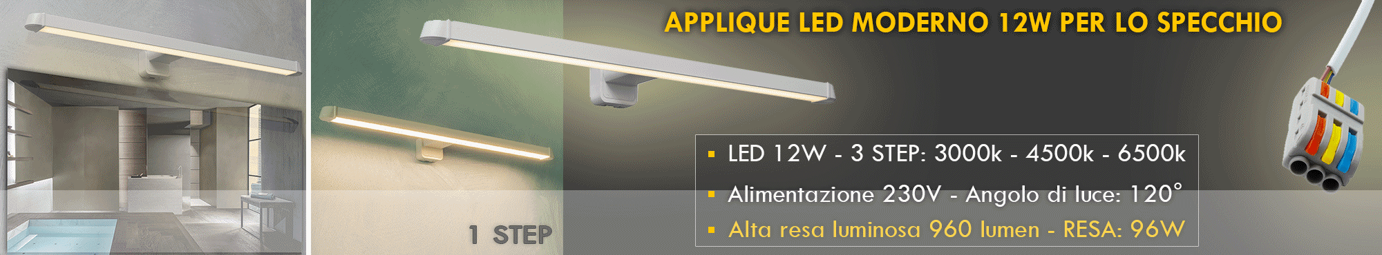 Si alimenta a 230V tramite il connettore a morsetti - Inoltre l'applique ha un angolo di luce ampio di 120 gradi con una resa cromatica RA >80.