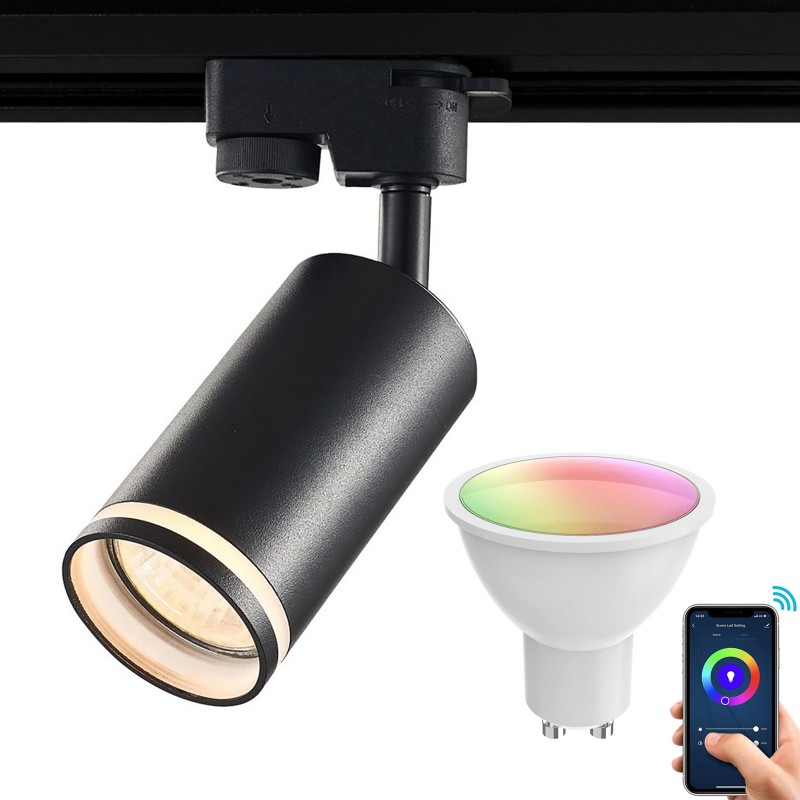 Elegante faretto monofase con tecnologia SMART adatto per installazioni su binari track monofase realizzato in alluminio dotato di staffa orientabile orientabile dal design moderno ideale per l'illuminazone interna di negozi, vetrine, abitazioni moderne, uffici, attività commerciali. Dotato di attacco GU10 viene fornito completo dilampada LED GU10 da 5W con tecnologia SMART WiFi compatibile con smartphone e gli assistenti vocali Amazon Alexa e Google Home. Il faretto ha una temperatura di luce RGB+CCT che consente di ottenere sia la luce colorata sia la luce bianca con possibilità di scegliere la tonalità desiderata da 2700K a 6500K.
