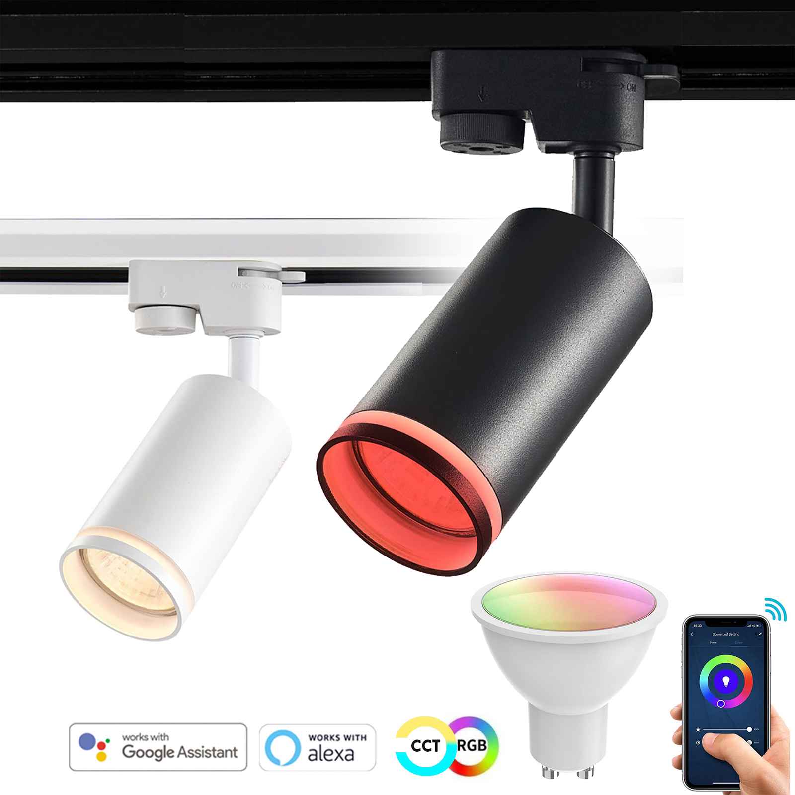 Elegante faretto monofase con tecnologia SMART adatto per installazioni su binari track monofase realizzato in alluminio dotato di staffa orientabile orientabile dal design moderno ideale per l'illuminazone interna di negozi, vetrine, abitazioni moderne, uffici, attività commerciali. Dotato di attacco GU10 viene fornito completo dilampada LED GU10 da 5W con tecnologia SMART WiFi compatibile con smartphone e gli assistenti vocali Amazon Alexa e Google Home. Il faretto ha una temperatura di luce RGB+CCT che consente di ottenere sia la luce colorata sia la luce bianca con possibilità di scegliere la tonalità desiderata da 2700K a 6500K.