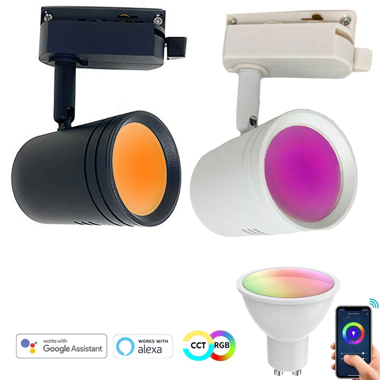 Faretto LED track moderno di forma cilindrica completo di lampada SMART WiFi GU10 compatibile con gli assistenti vocali Amazon Alexa e Google Home dotato LED da 5W con tecnologia RGB+CCT che consente di avere sia la luce colorata sia la luce bianca con possibilità di scegliere la tonalità preferita da 2700K a 6500K. Adatto per installazioni su binario monofase con possibilità di direzionare il fascio di luce secondo le esigenze.