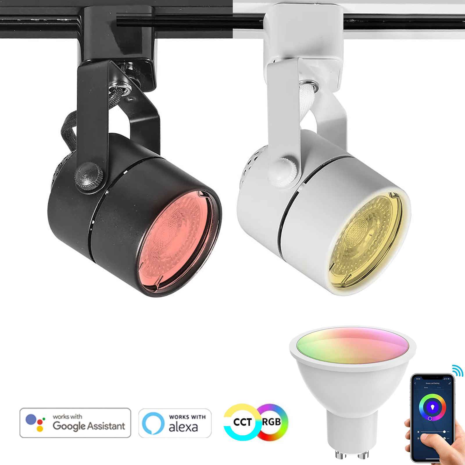 Faretto LED track orientabile di forma tonda completo di lampada SMART WiFi GU10 compatibile con gli assistenti vocali Amazon Alexa e Google Home dotato LED da 5W con tecnologia RGB+CCT che consente di avere sia la luce colorata sia la luce bianca con possibilità di scegliere la tonalità preferita da 2700K a 6500K. Adatto per installazioni su binario monofase con possibilità di direzionare il fascio di luce secondo le esigenze.