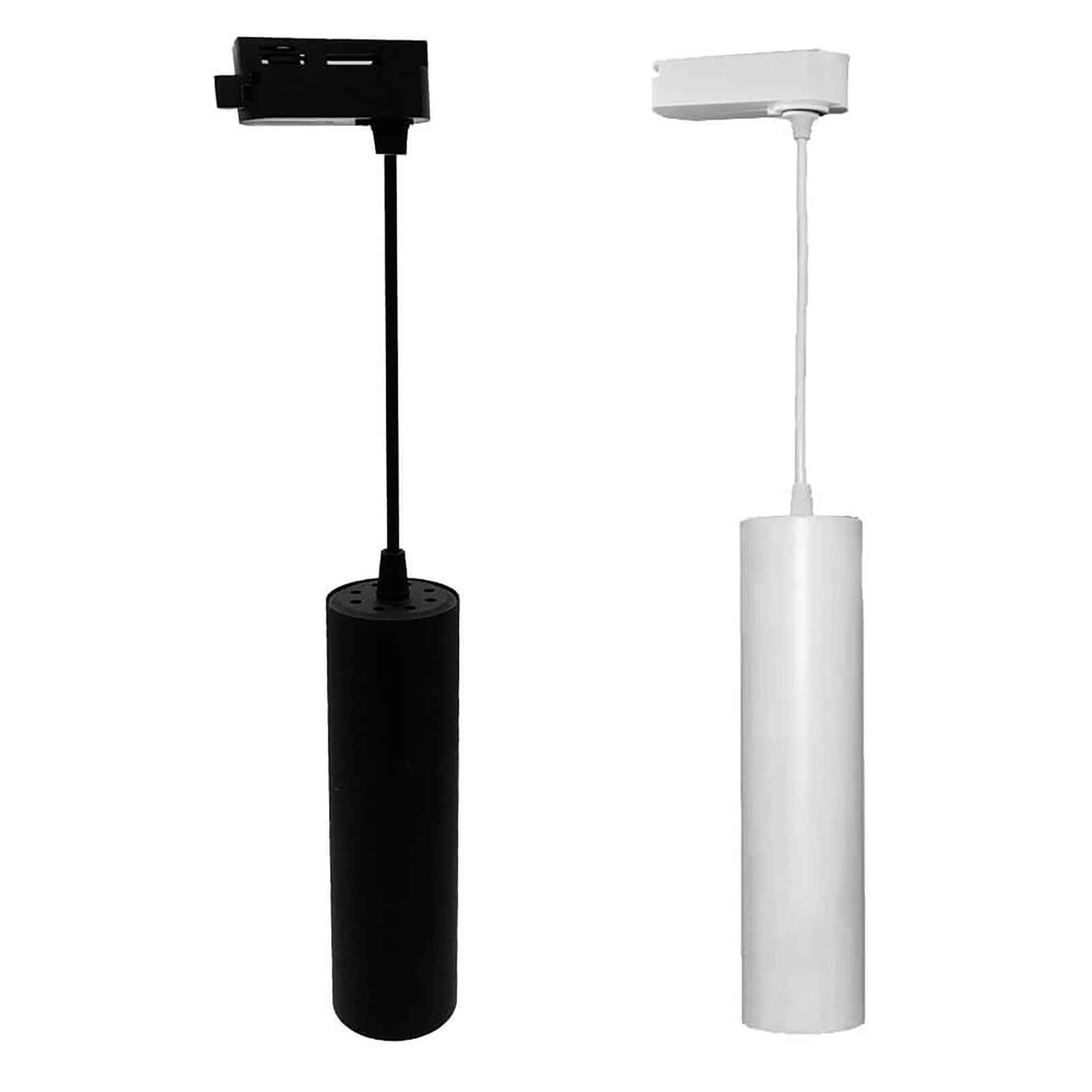 Lampada moderna a sospensione con attacco per binario monofase, realizzata in alluminio di forma cilindrica da design slim è disponibile in 2 colori bianco o nero secondo l'arredamento. Ideale per l'illuminazione interna di bar, caffè, ristoranti, negozi, ambienti domestici dall'arredamento moderno, adatta per sfruttare la versatilità l'illuminazione su binario track.
