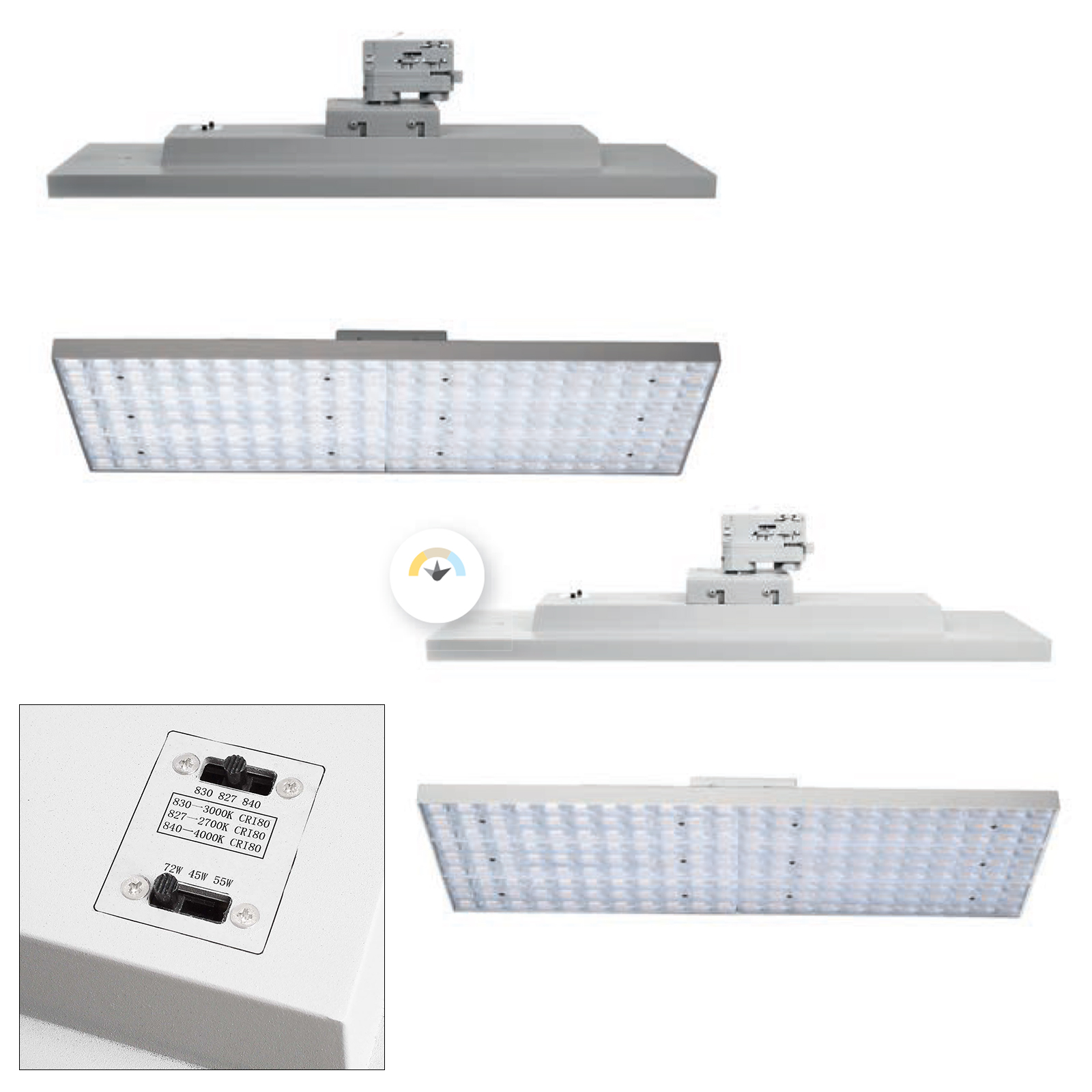 Inoltre sul retro è presente un altro selettore che consente di variare la potenza della luce da: 45W / 55W / 72W secondo l'ambiente dove viene installato. Tutto questo in un unico faretto. Inoltre questo faretto è disponibile in 2 colori: Bianco e Grigio per addattarsi al tipo di arredamento.