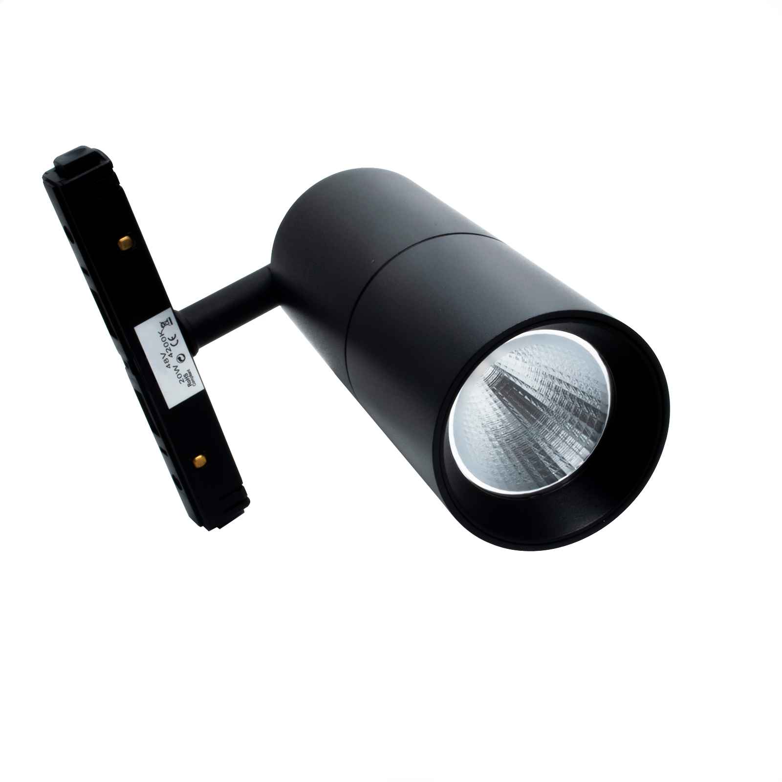 Il faretto è di forma cilindrica dotato di staffa con possibilità di inclinarlo secondo le proprie esigenze ed è compatibile con binari magnetici. Dotato di LED COB integrato ad alta efficienza energetica con potenza 20W. Realizzato in PVC di colore nero ha il diffusore trasparente per un'illuminazione.
