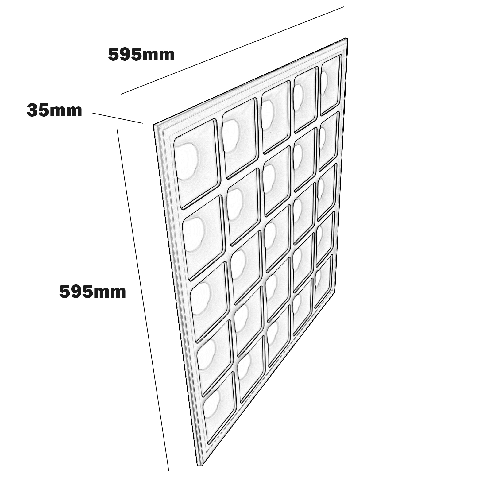 Dimensioni della pannello: 595mm x 595mm x 35mm.