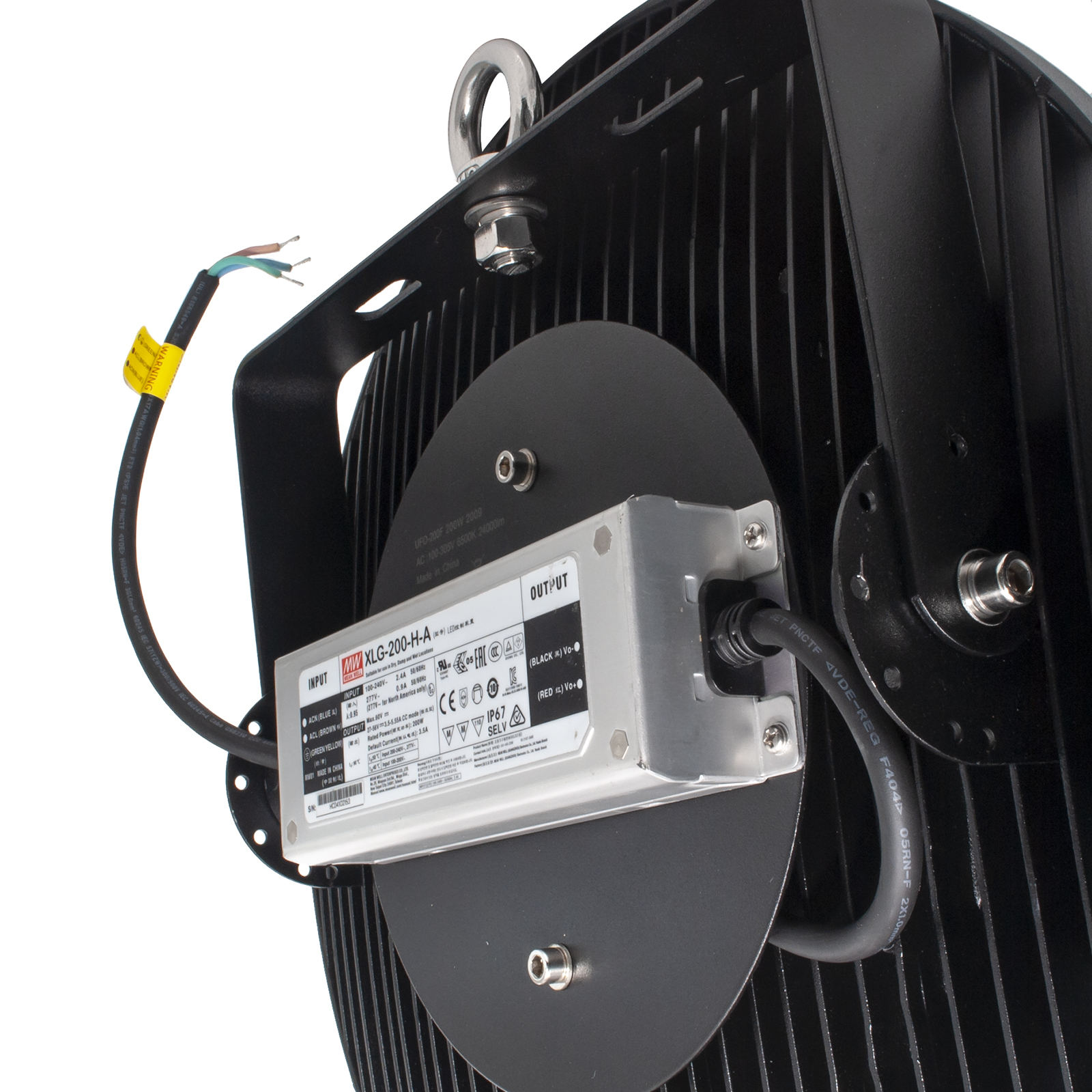 Il faro ha un grado di protezione IP65 resistente alle intemperie e gli agenti atmosferici adatto per installazioni anche all'esterno. Si alimenta a 230V tramite l'alimentatore di marca MeanWell posto sul retro ed emette un'intensità luminosa pari a 24000 lumen - Disponibile con temperatura luce 6500K - Adatto anche per officine magazzini, supermercati, parcheggi sotterranei.