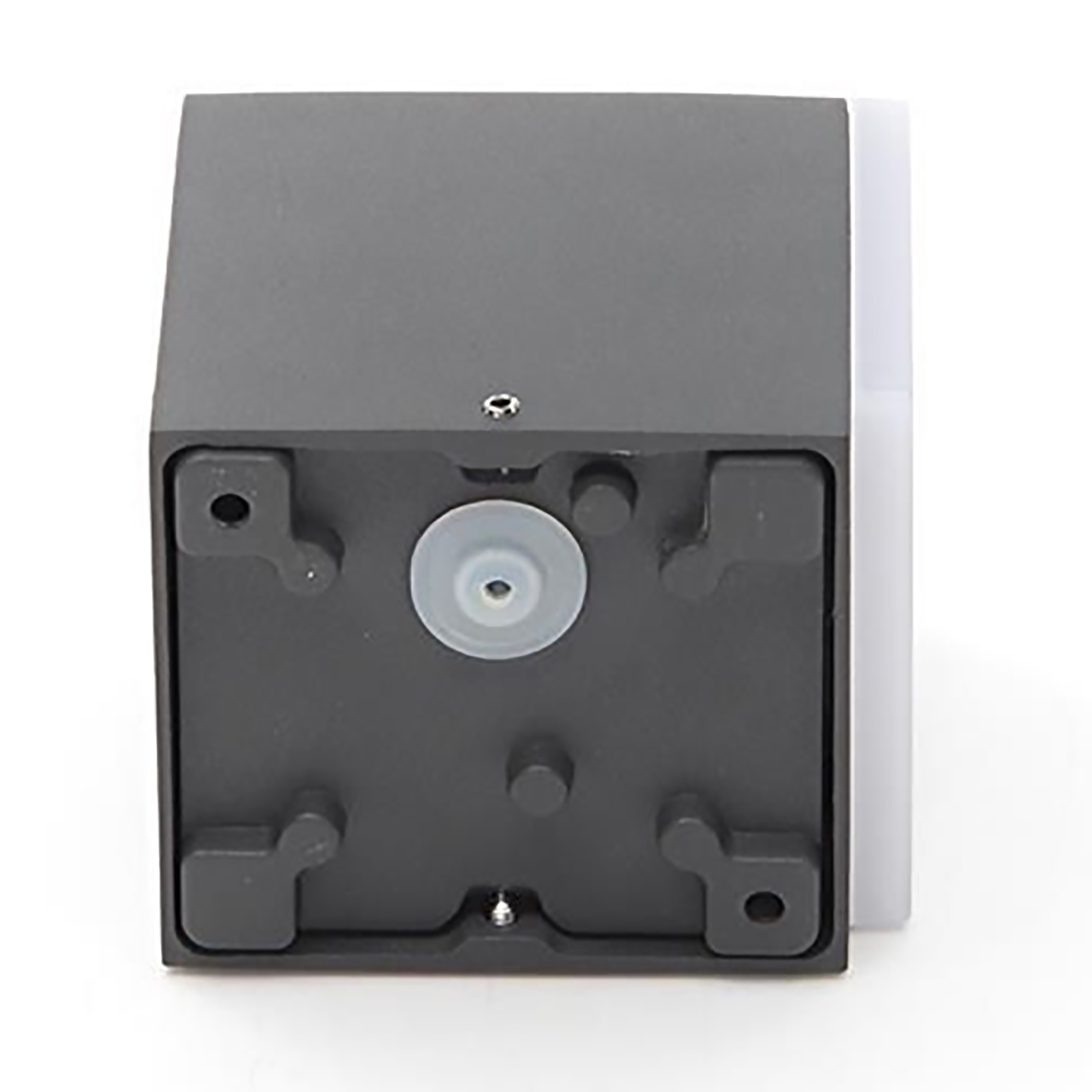Si alimenta a 230V tramite rete elettrica (non necessita di alimentatore in quanto già incluso all'interno di prodotto). L'applique ha una struttura solida a forma di cubo di colore grigio grafite verniciata a polveri epossidiche con diffusore in policarbonato opaco anabbagliante.
