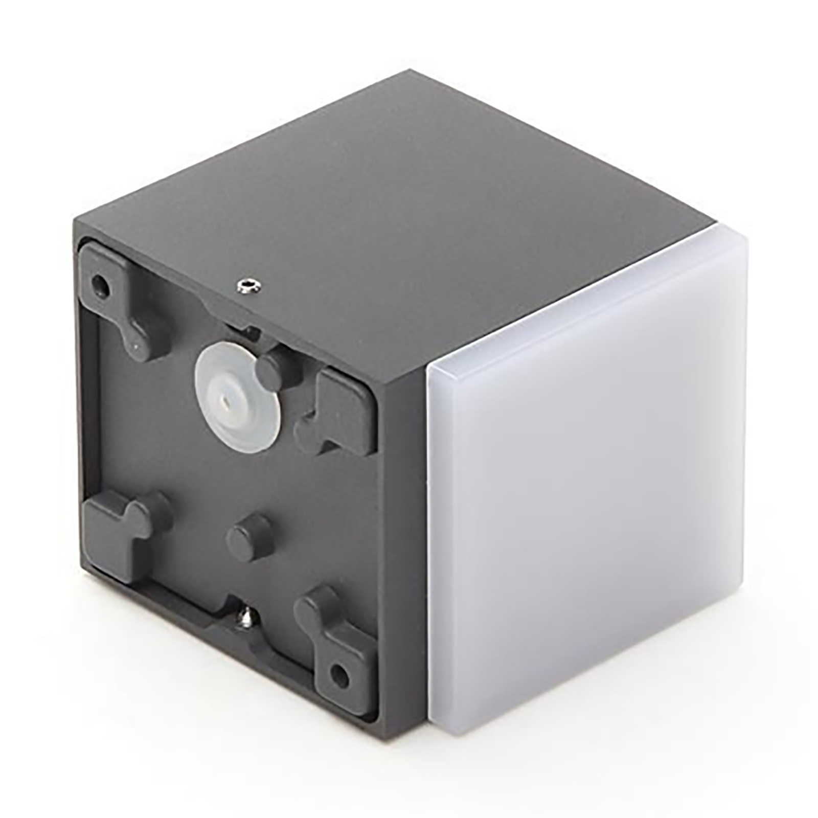 Si alimenta a 230V tramite rete elettrica (non necessita di alimentatore in quanto già incluso all'interno di prodotto). L'applique ha una struttura solida a forma di cubo di colore grigio grafite verniciata a polveri epossidiche con diffusore in policarbonato opaco anabbagliante.