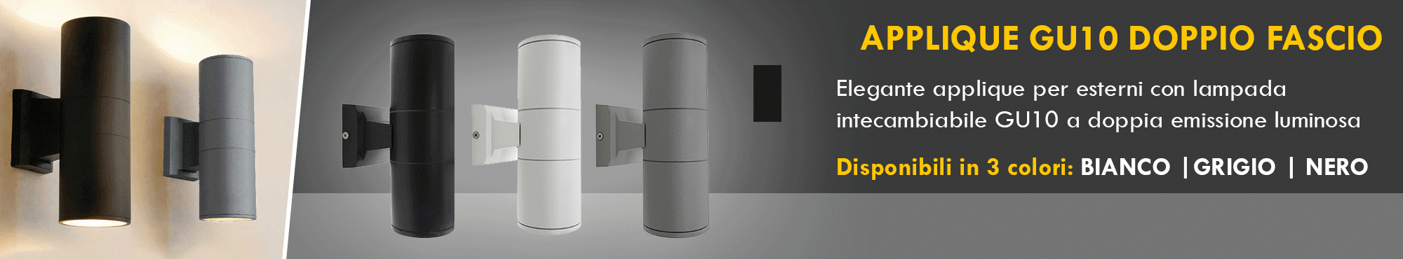 Applique moderno a LED adatto per installazioni a parete o muro dotato di doppio portalampada con attacco GU10 ideale per uso esterno per illuminare ingressi di abitazioni - all'esterno di negozi - attività commerciali - per decorare il giardino - come luce decorativa sotto porticati. Grazie al doppio attacco supporta 2 lampade GU10 generando un particolare effetto luminoso UP & DOWN che va sia verso il basso che verso l'alto.