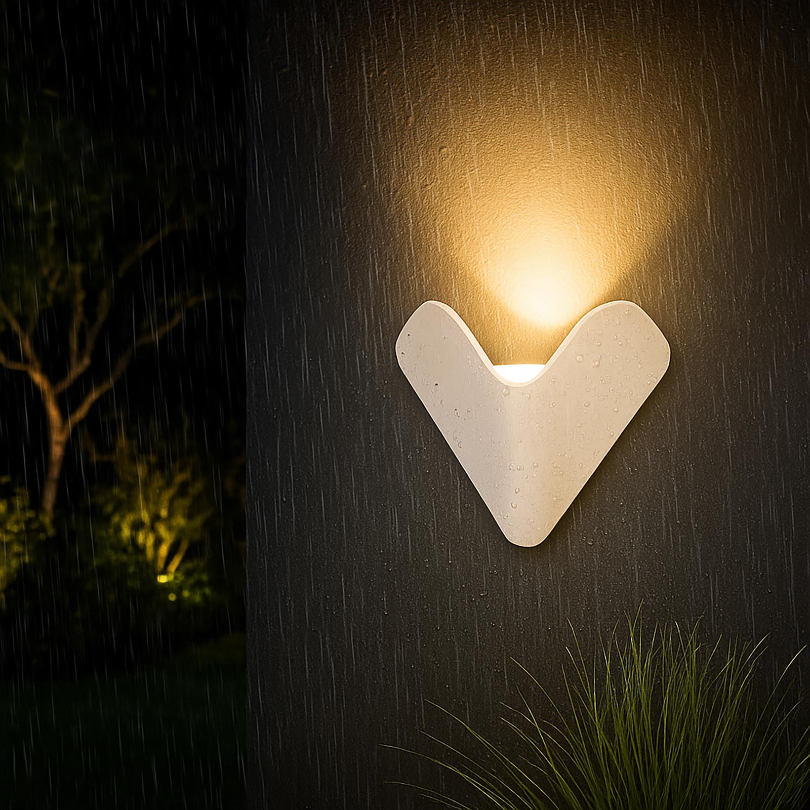 L’effetto luce generato si distingue per la forma triangolare proiettata sulla parete, con un angolo di diffusione di circa 80°, ideale per valorizzare superfici verticali e creare atmosfere suggestive. La struttura è realizzata in alluminio resistente e trattata per garantire protezione contro pioggia, polvere e agenti atmosferici, con grado di impermeabilità IP65.