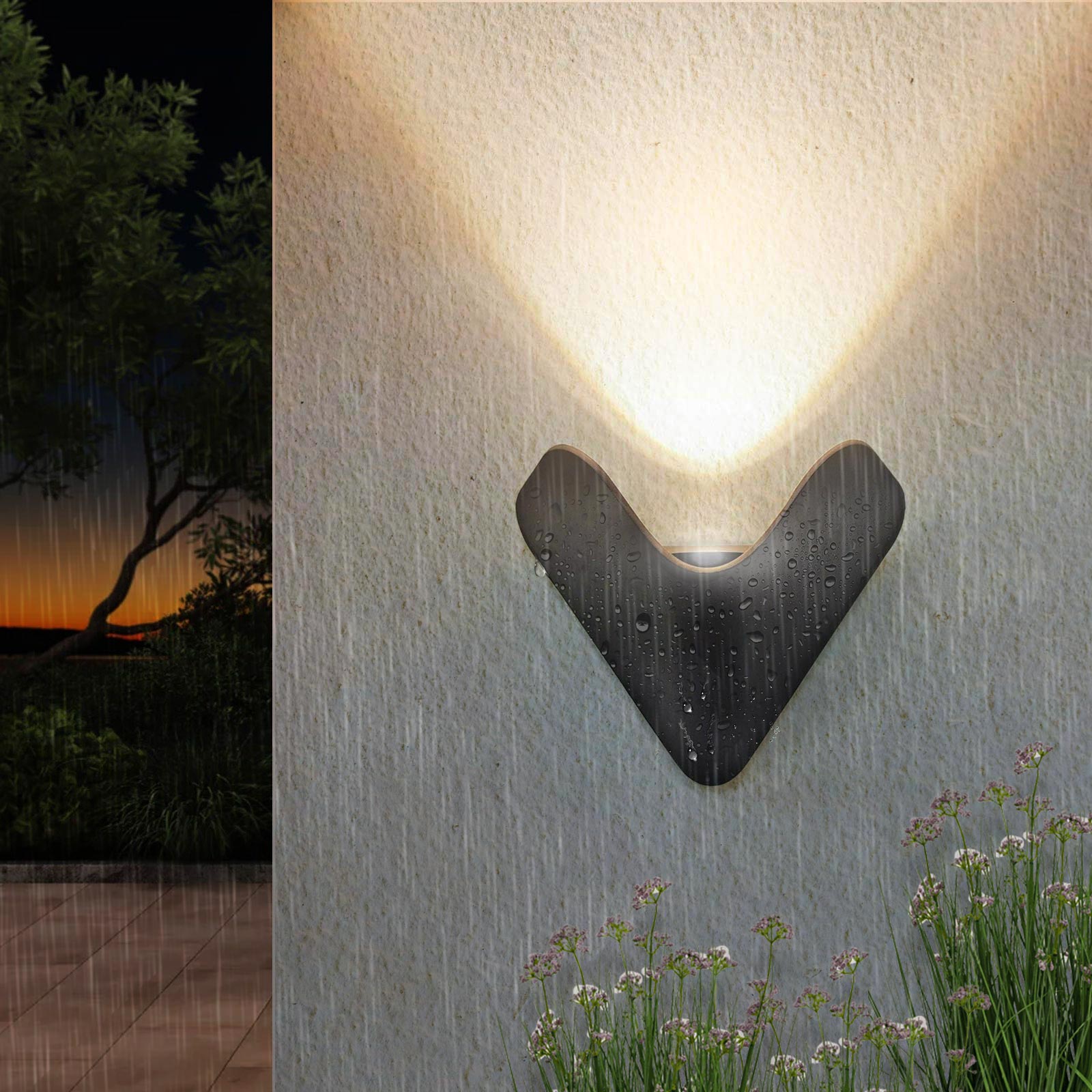 L’effetto luce generato si distingue per la forma triangolare proiettata sulla parete, con un angolo di diffusione di circa 80°, ideale per valorizzare superfici verticali e creare atmosfere suggestive. La struttura è realizzata in alluminio resistente e trattata per garantire protezione contro pioggia, polvere e agenti atmosferici, con grado di impermeabilità IP65.