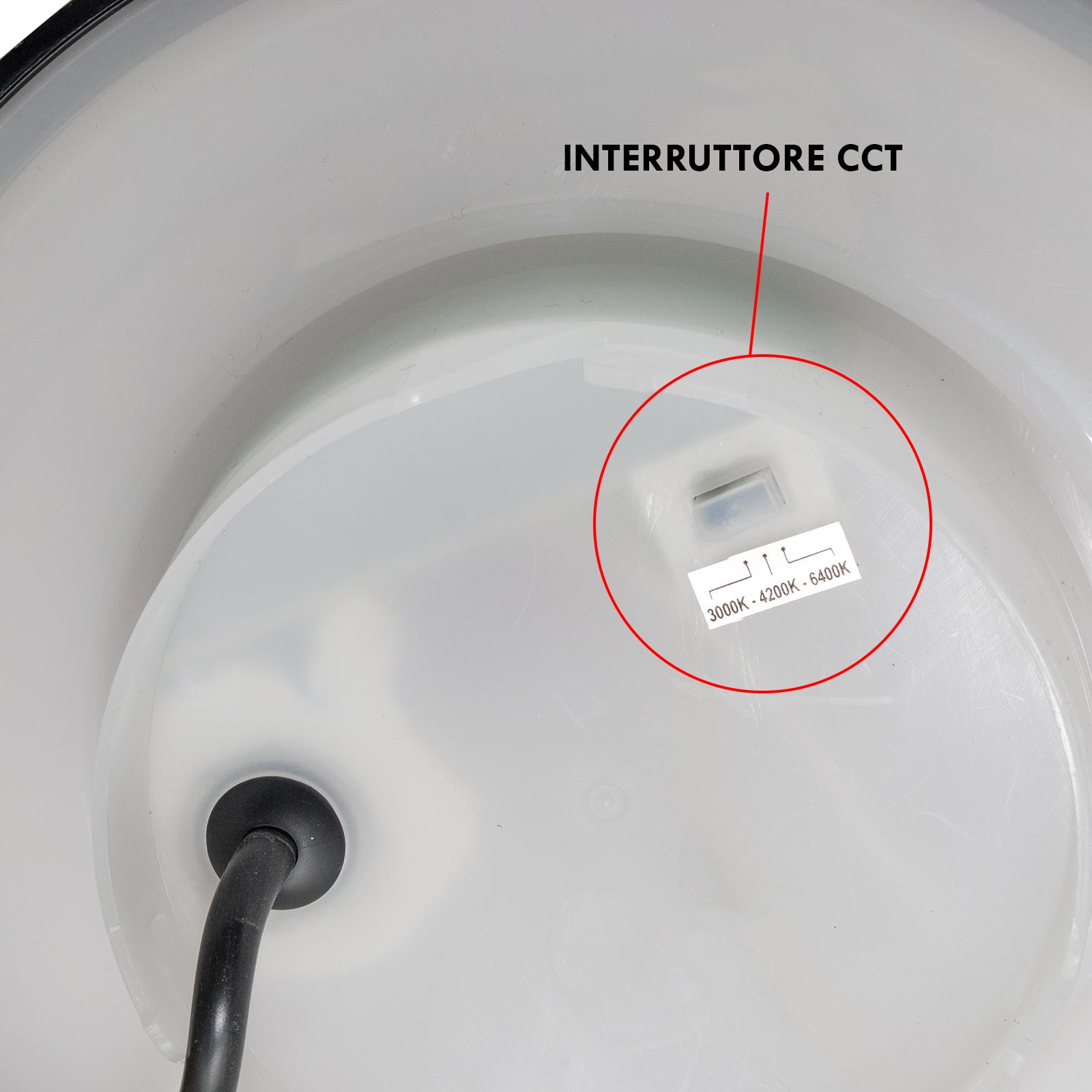 Inoltre all'interno è presente un interruttore CCT che consente di selezionare la temperatura di luce desiderata: 3000K (luce calda), 4000K (luce naturale) e 6500K (luce fredda), per adattarsi meglio ad ogni esigenza di illuminazione. Inoltre questa lampada ha un angolo di luce diffuso di 120 gradi.