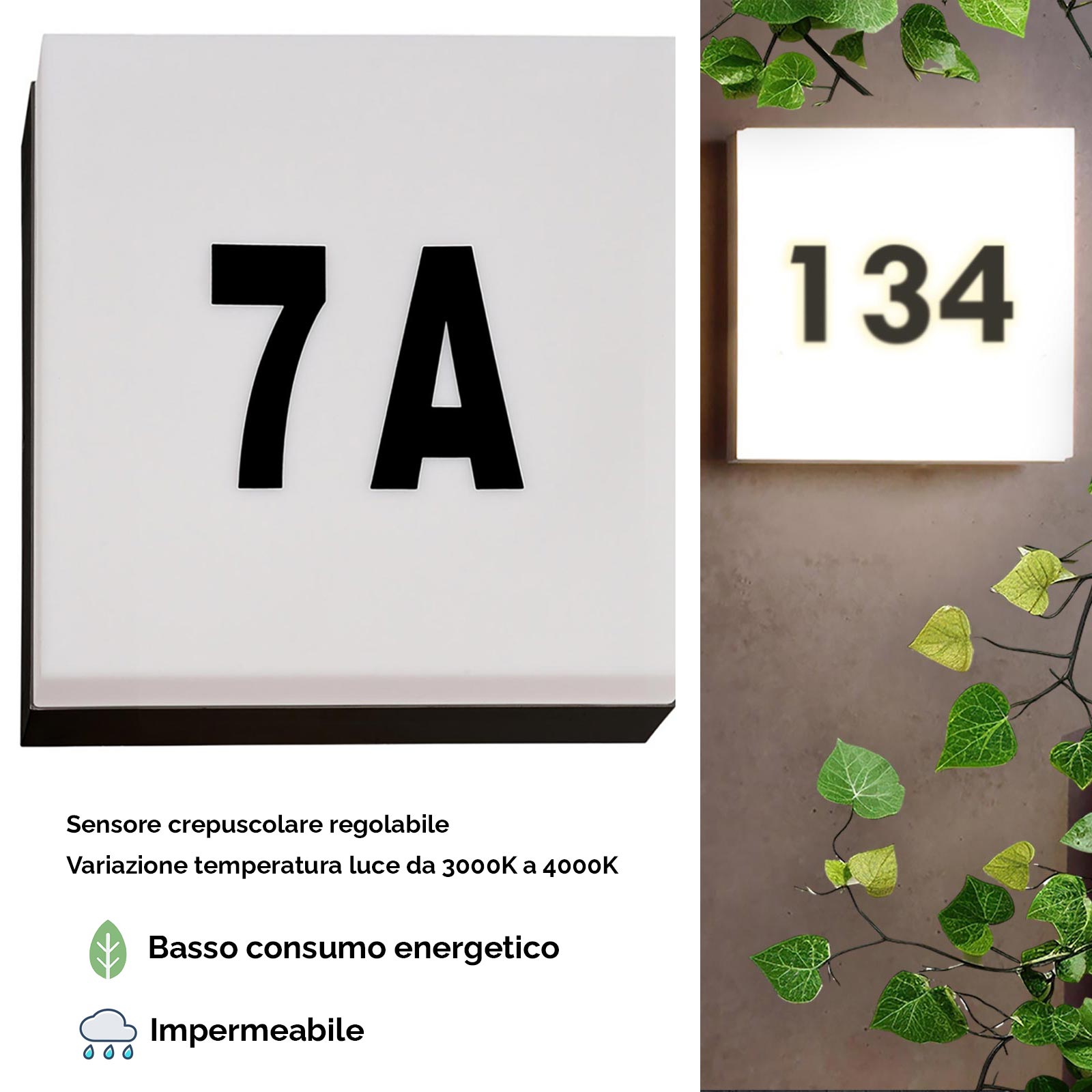 Applique crepuscolare a LED per numeri civici realizzato in plastica utile per l'installazione a parete utile all'esterno di ingressi di abitazioni per segnalare il numero civico con stile ed eleganza, ideale anche all'esterno di negozi, palazzi ed in tutti quei posti dove si vuole segnalare un numero civico.