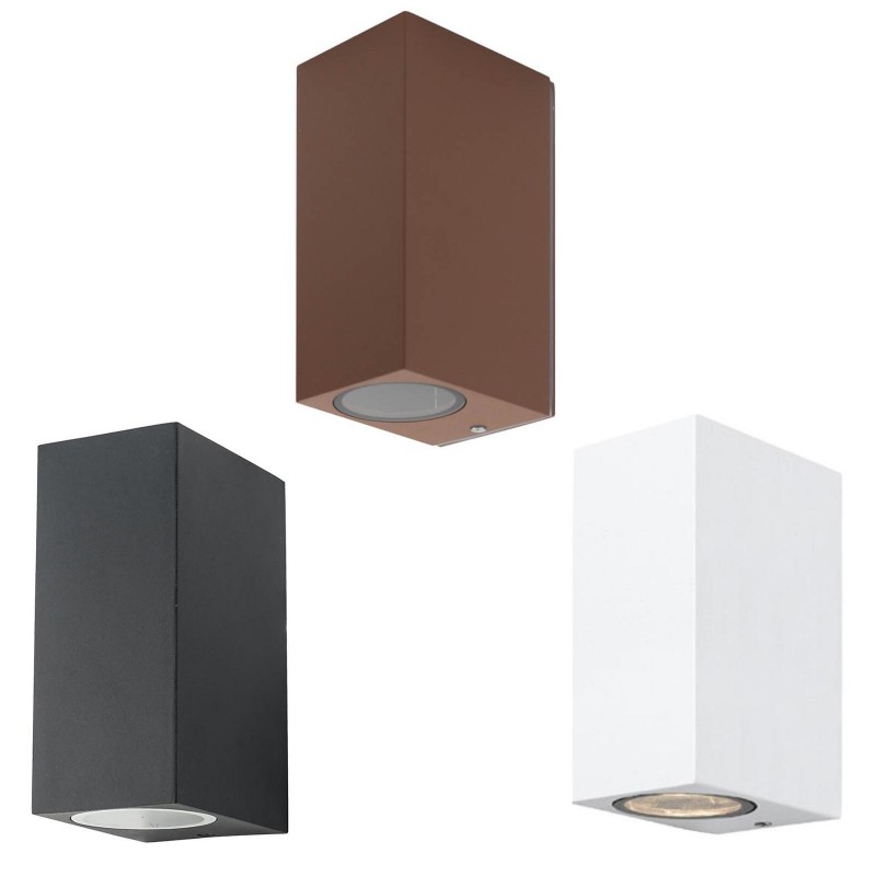 Elegante lampada da parete con doppio fascio luminoso UP & DOWN ideale per uso esterno per illuminare e decorare giardini, case, facciate, negozi, attività commerciali e in tutti quei luoghi dove è necessario avere un punto luce dal design moderno. L'applique è dotata di doppio portalampada con attacco GU10, permette l'installazione di 2 faretti GU10 e proietta un doppio fascio di luce dall'alto verso il basso, creando un particolare effetto luminoso su pareti e pareti.