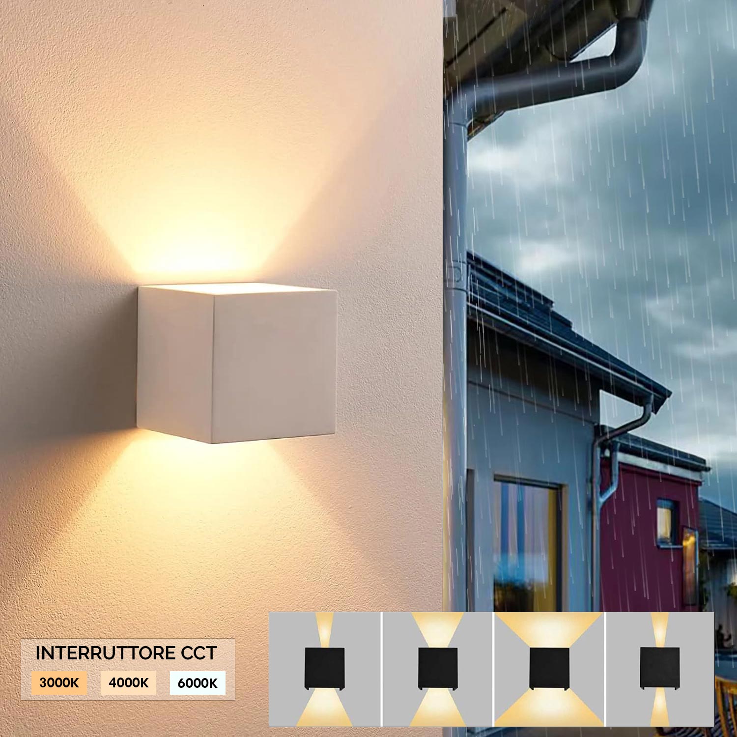 Lampada da parete moderna con tecnologia LED CCT a forma di cubo con alette regolabili realizzata in alluminio progettata per illuminare pareti esterne e interne con stile moderno e funzionalità regolabile. Ideale per creare effetti di luce su pareti e muri di abitazioni, all'esterno di giardini, per decorare ambienti interni ed in tutti quei posti dove si vuole installare un prodotto che oltre ad illuminare diventa un complemento di arredo. Disponibile in 4 colori: bianco, grigio, nero e marrone.