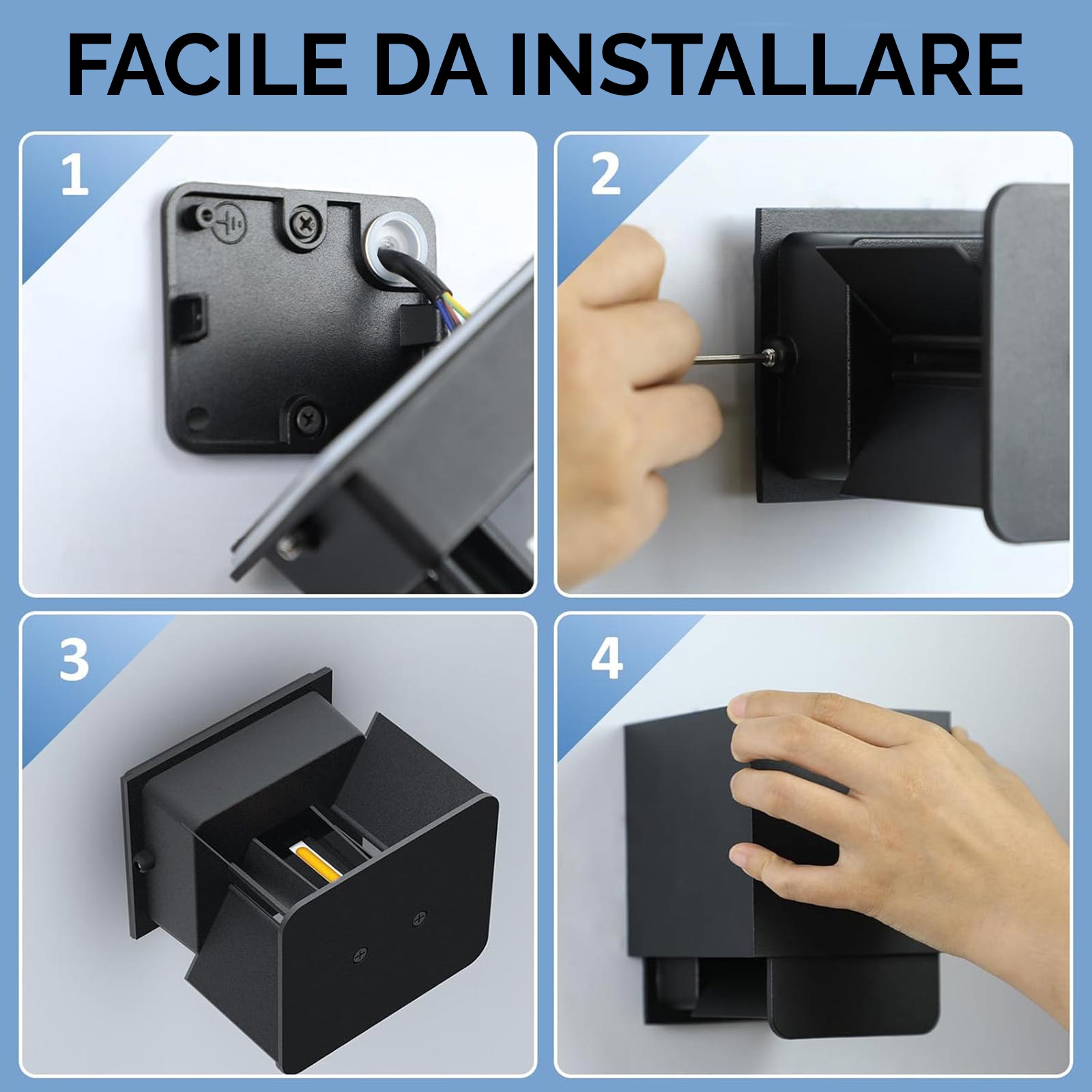 Il corpo in alluminio verniciato a polveri epossidiche garantisce resistenza agli agenti atmosferici, mentre il grado di protezione IP65 assicura un’elevata impermeabilità per installazioni sicure in ambienti esposti come facciate, giardini, terrazze e ingressi. La lampada integra due moduli LED da 6W ciascuno di ultima generazione, per un totale di 12W di potenza e 1000 lumen, con tecnologia CCT selezionabile (3000K, 4000K, 6500K) tramite interruttore interno, che permette di adattare la tonalità della luce all’ambiente