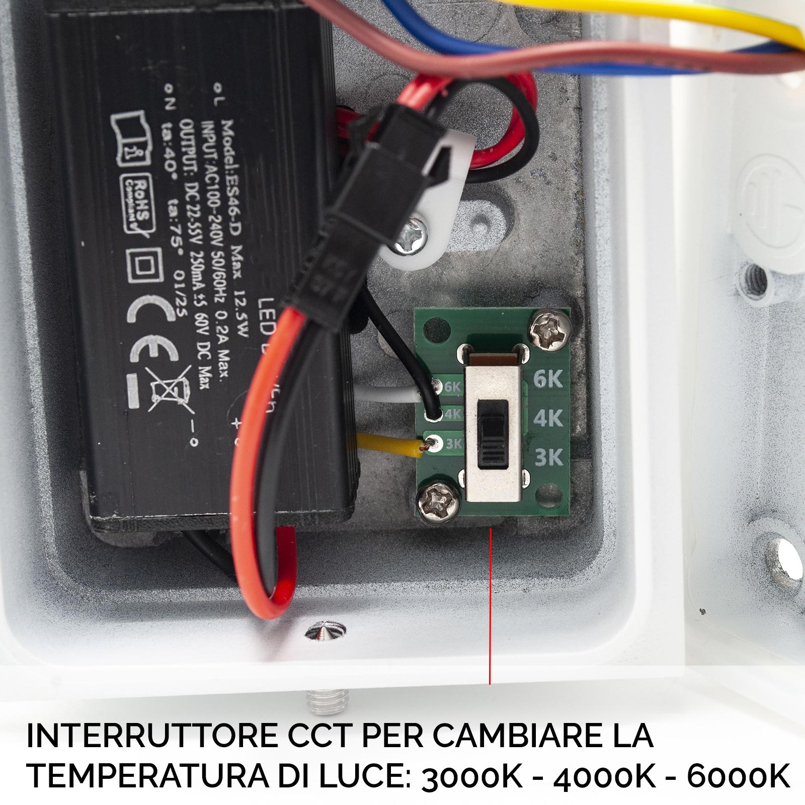 Il corpo in alluminio verniciato a polveri epossidiche garantisce resistenza agli agenti atmosferici, mentre il grado di protezione IP65 assicura un’elevata impermeabilità per installazioni sicure in ambienti esposti come facciate, giardini, terrazze e ingressi. La lampada integra due moduli LED da 6W ciascuno di ultima generazione, per un totale di 12W di potenza e 1000 lumen, con tecnologia CCT selezionabile (3000K, 4000K, 6500K) tramite interruttore interno, che permette di adattare la tonalità della luce all’ambiente