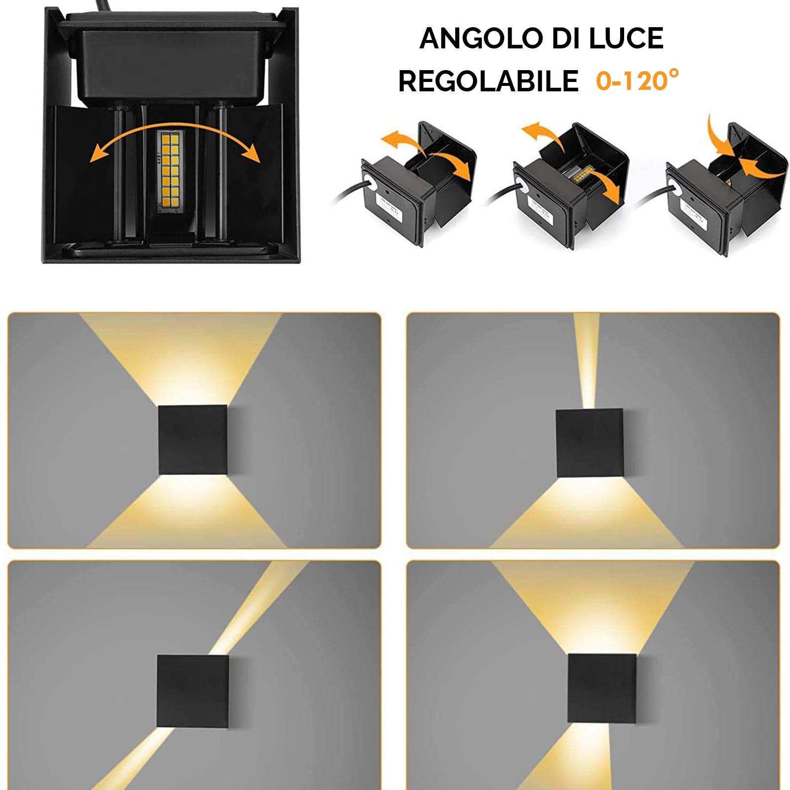Adatto prevalentemente per creare degli effetti luminosi decorativi lungo le pareti di un edificio o all'ingresso esterno di abitazioni, uffici, hotel o negozi. La luce viene proiettata verso il basso e verso l'alto, è possibile scegliere il cono di luce tra luce diffusa o fascio di luce stretto come potete vedere in foto semplicemente regolando le alette. L'angolo di luce è regolabile da 0 a 120 gradi.