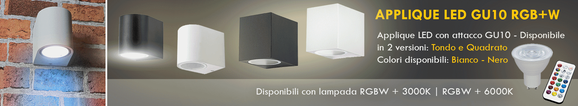 Elegante applique da parete GU10 a singolo fascio di luce RGBW ideale per l'esterno per illuminare e decorare giardini, abitazioni, facciate, negozi, attività commerciali ed in tutti quei posti dove è necessario avere un punto luce dal design moderno. L'applique è dotato di portalampada con attacco GU10, consente l'installazione di 1 faretti GU10 con potenza max. 35W.