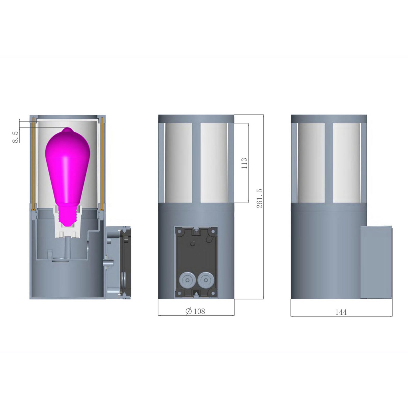Dimensioni dell'applique: 261.5mm x 144mm Ø 108mm - Altezza dell'alloggiamento della lampada: 113mm.