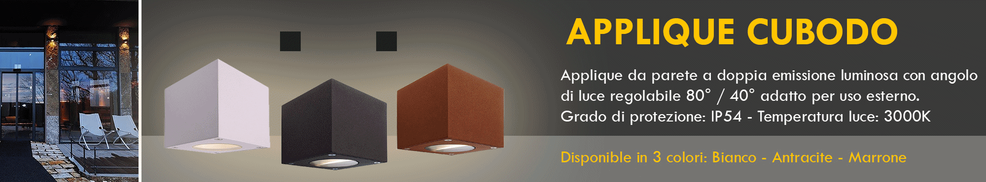 CUBODO linea di applique per esterno con illuminazione UP & DOWN ideale per illuminare e decorare pareti estere di abitazioni, facciate, balconi, terrazzi, ingressi, giardini. Inoltre è possibile regolare l'angolo luce da 80 gradi per una luce più diffusa fino a 40 gradi per una luce mirata. Realizzati con struttura in alluminio pressofuso di alta qualità sono disponibili in 3 colorazioni: bianco, antracite, e corten (marrone) per adattarsi a tutti i tipi di arredamento.