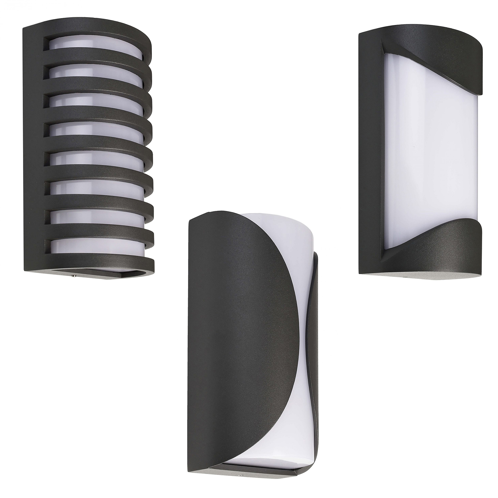 Disponibili in 3 modelli versione orizzontale, versione verticale, con linee orizzontali. L'intensità luminosa varia in base al modello da 210 lumen fino a 325 lumen. Sono realizzati in alluminio pressofuso di alta qualità verniciati di colore colore grigio scuro per adattarsi a tutti i tipi di arredamento. Gli applique hanno un grado di protezione IP54 resistente alle intemperie e gli agenti atmosferici.