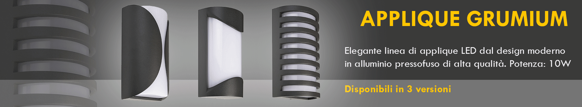 Grumium serie di applique a LED dal design moderno realizzati in alluminio pressofuso con diffusore in policarbonato opaco anabbagliante, adatti per installazione a parete o muri per illuminare e decorare gli esterni di abitazioni, negozi, giardini, cantine, balconi, terrazzi, garage, parcheggi ed in tutti quei posti dove c'è bisogno di una fonte luminosa che oltre ad illuminare arreda gli spazi esterni.