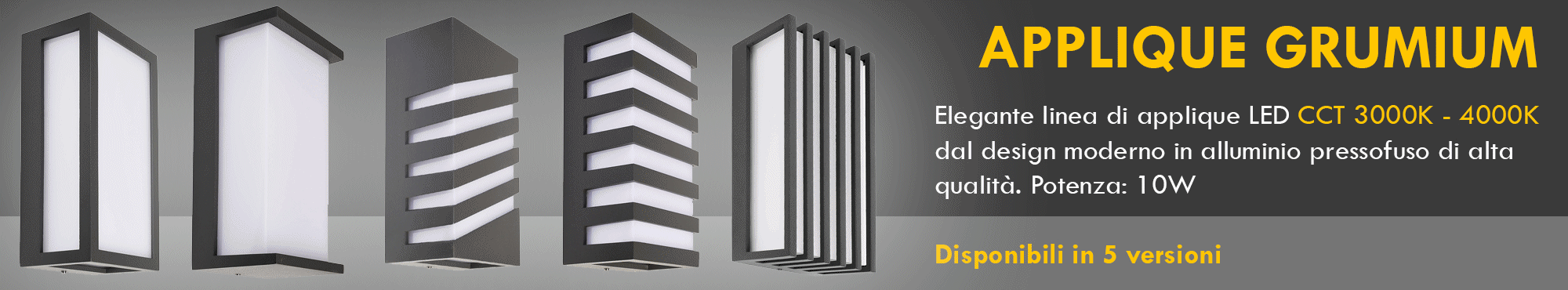 Grumium CCT serie di applique a LED dal design moderno realizzati in alluminio pressofuso con diffusore in policarbonato opaco anabbagliante, adatti per installazione a parete o muri per illuminare e decorare gli esterni di abitazioni, negozi, giardini, cantine, balconi, terrazzi, garage, parcheggi ed in tutti quei posti dove c'è bisogno di una fonte luminosa che oltre ad illuminare arreda gli spazi esterni.