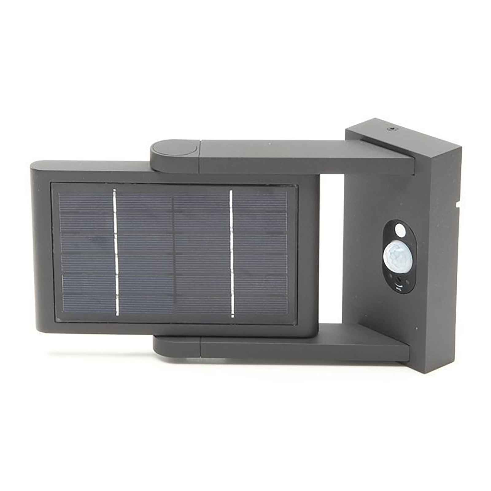 Applique solare a LED da design moderno adatto per installazioni a parete dotato di pannello solare ideale per esterno per illuminare terrazzi, balconi, ingressi, giardini, porticati. Questa lampada è dotata di diffusore orientabile fino a 180 gradi con LED integrati con potenza 1.60W. Realizzata in alluminio di colore grigio scuro ha un grado di protezione IP54 resistente alle intemperie e gli agenti atmosferici.