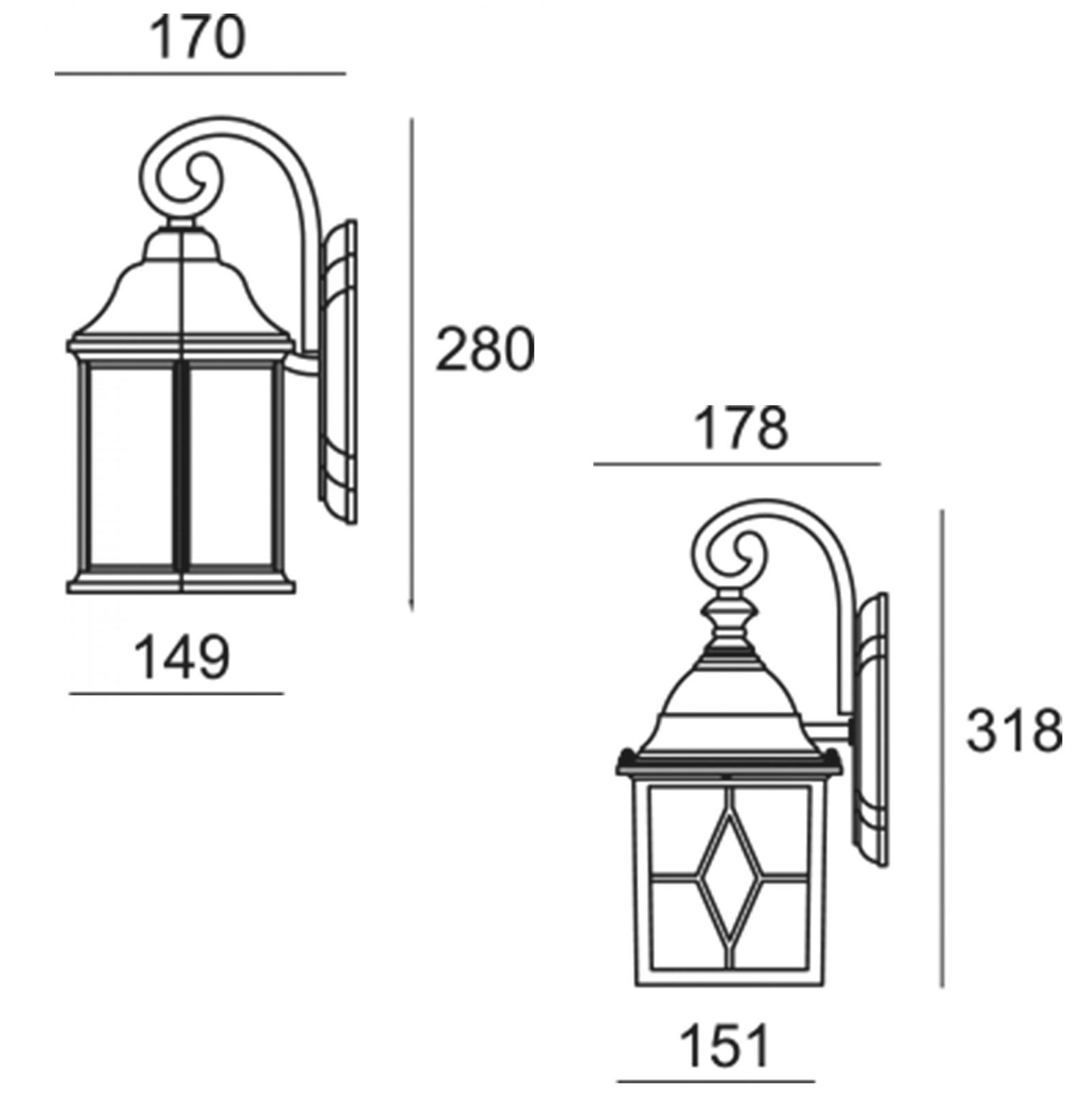 Dimensioni dell'applique SAIPH: 170mm x 149mm x 280mm - Dimensioni dell'applique SARGAS: 178mm x 151mm x 318mm