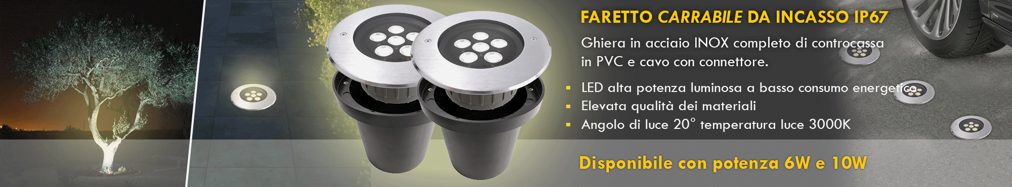 Il faretto ha un angolo di luce molto stretto di 20 gradi adatto anche come luce mirata per l'illuminazione di alberi, piante, cespugli, fontane. Realizzato con corpo in acciaio inox di alta qualità verniciato a polveri epossidiche adatto resistere alle intemperie e gli agenti atmosferici, ha un grado di protezione IP67. Viene fornito completo di contro cassa in pvc e cavo alimentazione da 0.5 metri. Può essere facilmente installato in pavimenti, terreno, cemento, marciapiedi, pareti, muri.