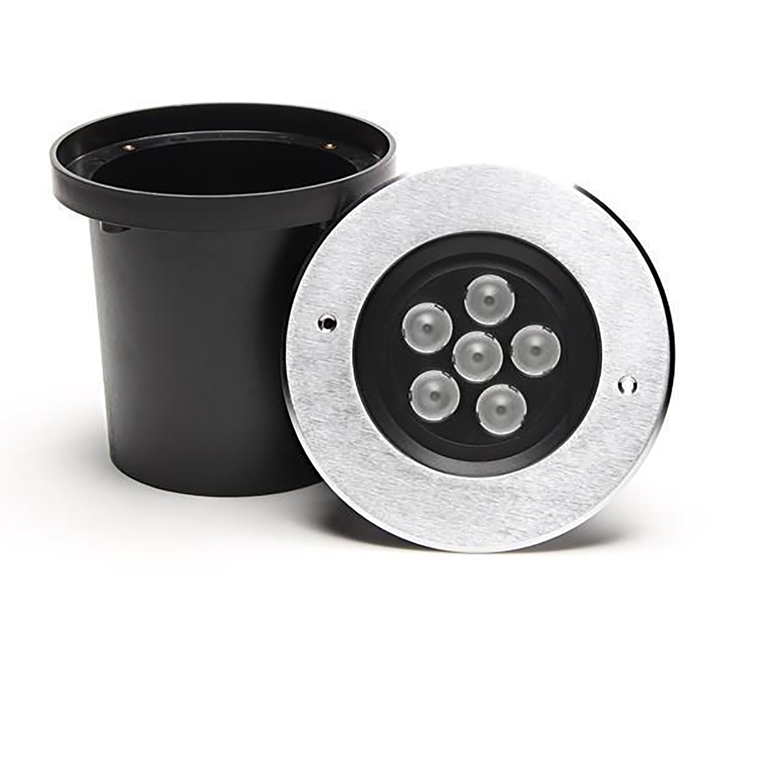 Faretto LED SPOT calpestabile CARRABILE da incasso di forma tonda colore argento adatto per uso esterno dotato di 6 LED HIGH POWER ad alta efficienza energetica disponibile con potenza 6W e 10W ideale per segnalare percorsi pedonali, come luci di sicurezza in parcheggi, garage, all'esterno di giardini, come segnapassi per viali, sentieri, a bordo piscina, adatto anche come luce per segnalare gradini, scale.