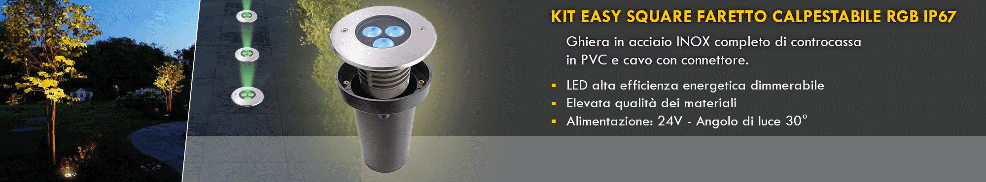 GROUND RECESSED LIGHT - Faretto LED calpestabile CARRABILE dimmerabile adatto per uso esterno dotato di 3 LED RGB multicolore con potenza 7.40W ideale per creare effetti di luce colorata in spazi esterni come segnapassi per percorsi pedonali, come luci di sicurezza in parcheggi, garage, all'esterno di giardini, per viali, sentieri, a bordo piscina, adatto anche come luce per segnalare gradini, scale.