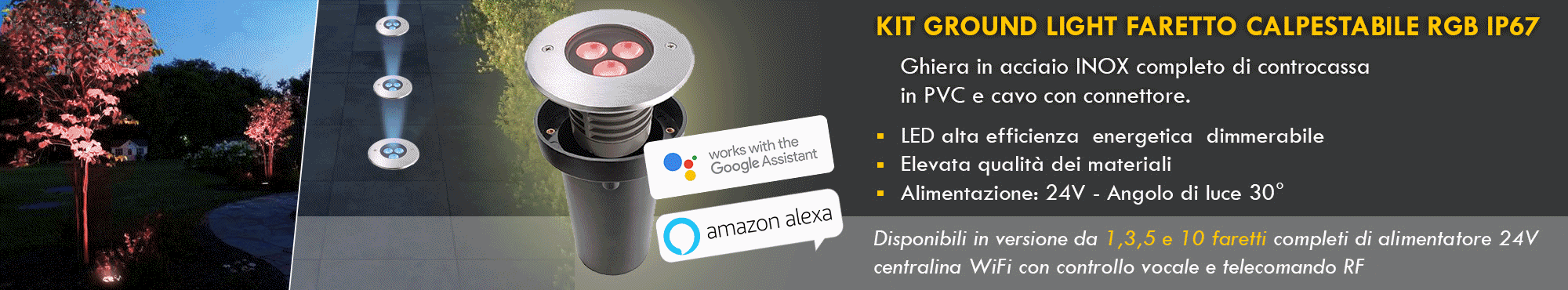 GROUND RECESSED LIGHT - Composto da 1 faretto LED RGB calpestabile CARRABILE, una centralina SMART WiFi, un alimentatore a 24V ed un telecomando RF per gestire le funzioni. Adatto per uso esterno dotato di 3 LED RGB multicolore con potenza 7.40W ideale per creare effetti di luce colorata in spazi esterni come segnapassi per percorsi pedonali, come luci di sicurezza in parcheggi, garage, all'esterno di giardini, per viali, sentieri, a bordo piscina, adatto anche come luce per segnalare gradini, scale.