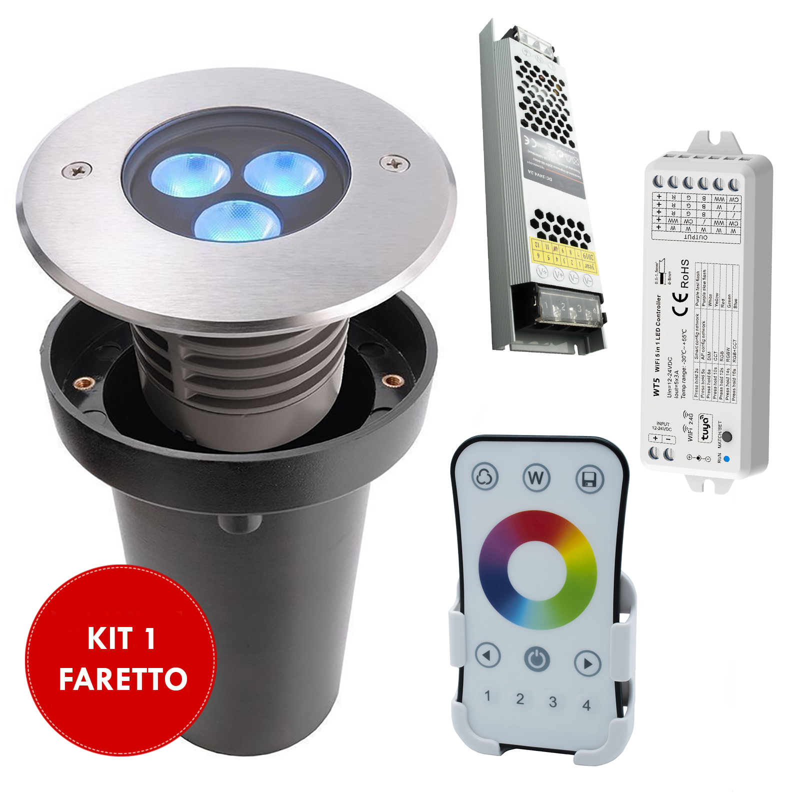 GROUND RECESSED LIGHT - Composto da 1 faretto LED RGB calpestabile CARRABILE, una centralina SMART WiFi, un alimentatore a 24V ed un telecomando RF per gestire le funzioni. Adatto per uso esterno dotato di 3 LED RGB multicolore con potenza 7.40W ideale per creare effetti di luce colorata in spazi esterni come segnapassi per percorsi pedonali, come luci di sicurezza in parcheggi, garage, all'esterno di giardini, per viali, sentieri, a bordo piscina, adatto anche come luce per segnalare gradini, scale.