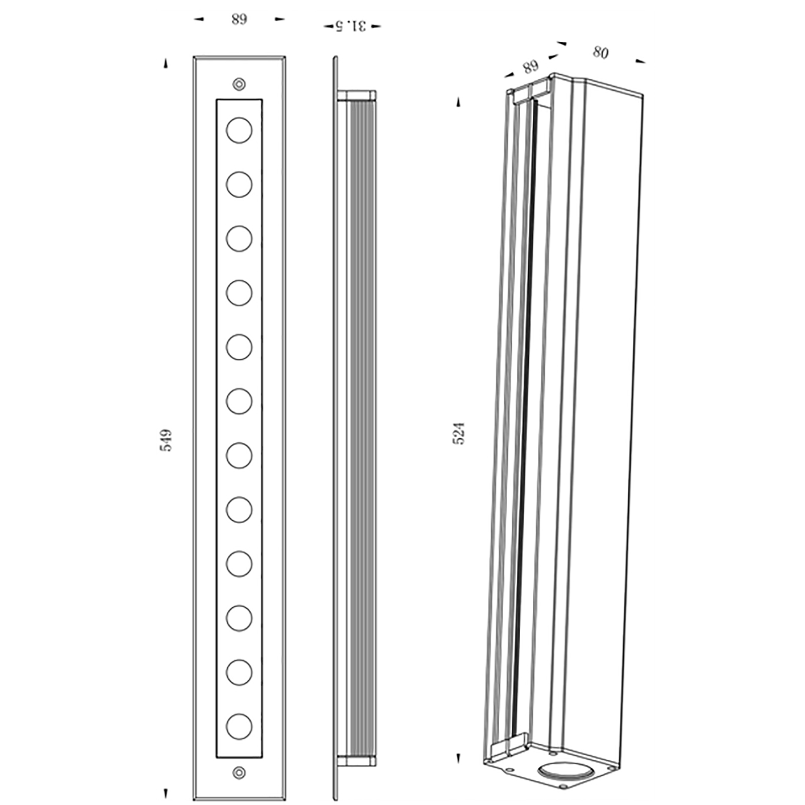 Dimensioni del faretto: 549mm x 68mm x 32.5mm - Dimensioni del foro per l'incasso: 524mm x 58mm.