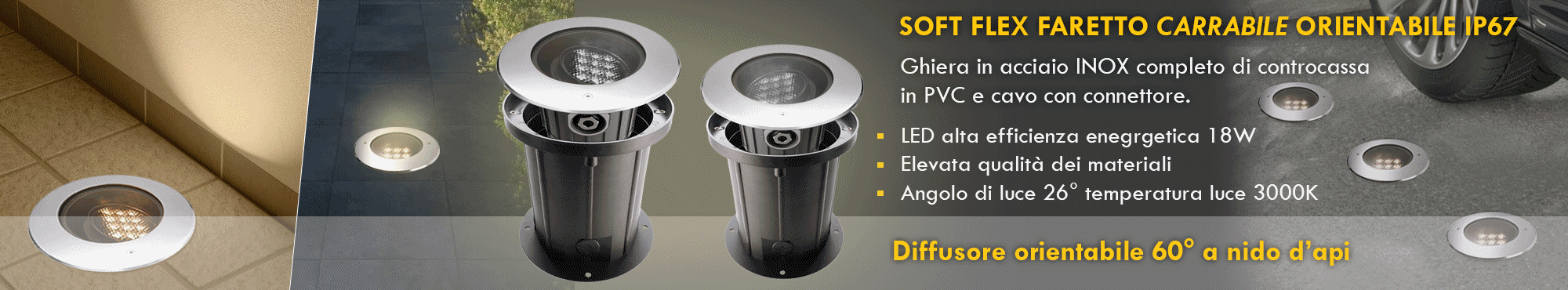 SOFT FELX Faretto LED calpestabile CARRABILE con diffusore a nido d'api ORIENTABILE adatto per uso esterno dotato di 12 LED ad alta luminosità con potenza 18W ideale come segnapassi per percorsi pedonali, come luci di sicurezza in parcheggi, garage, all'esterno di giardini, per viali, sentieri, a bordo piscina, adatto anche come luce per segnalare gradini, scale. Il diffusore a nido d'api consente una luminosità più omogenea senza abbagliare la vista.