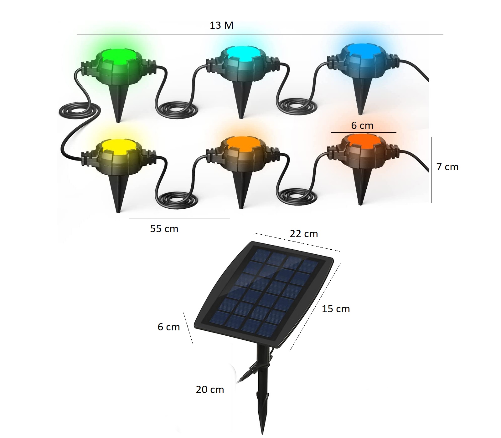 Particolare catena luminosa solare RGBW con tecnologia SMART dotata di 16 faretti con LED integrati multicolore ideale per ambienti esterni per illuminare e decorare giardini, abitazioni all'esterno di centri commerciali, parchi di divertimento, parchi gioco. La catena viene fornita completa di mini picchetti per il fissaggio a terreno di ogni LED e di supporti per il fissaggio a parete e muri.