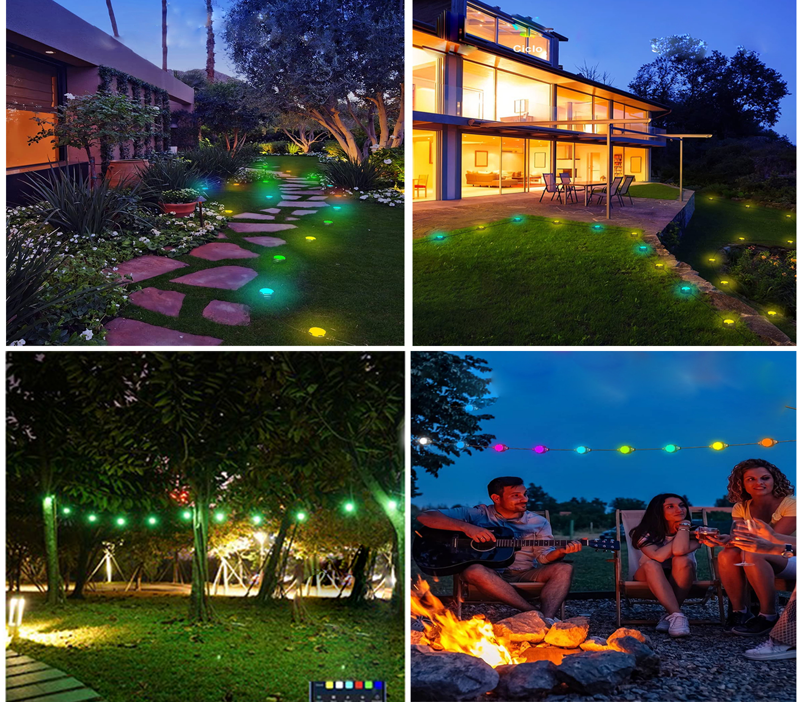 Particolare catena luminosa solare RGBW con tecnologia SMART dotata di 16 faretti con LED integrati multicolore ideale per ambienti esterni per illuminare e decorare giardini, abitazioni all'esterno di centri commerciali, parchi di divertimento, parchi gioco. La catena viene fornita completa di mini picchetti per il fissaggio a terreno di ogni LED e di supporti per il fissaggio a parete e muri.